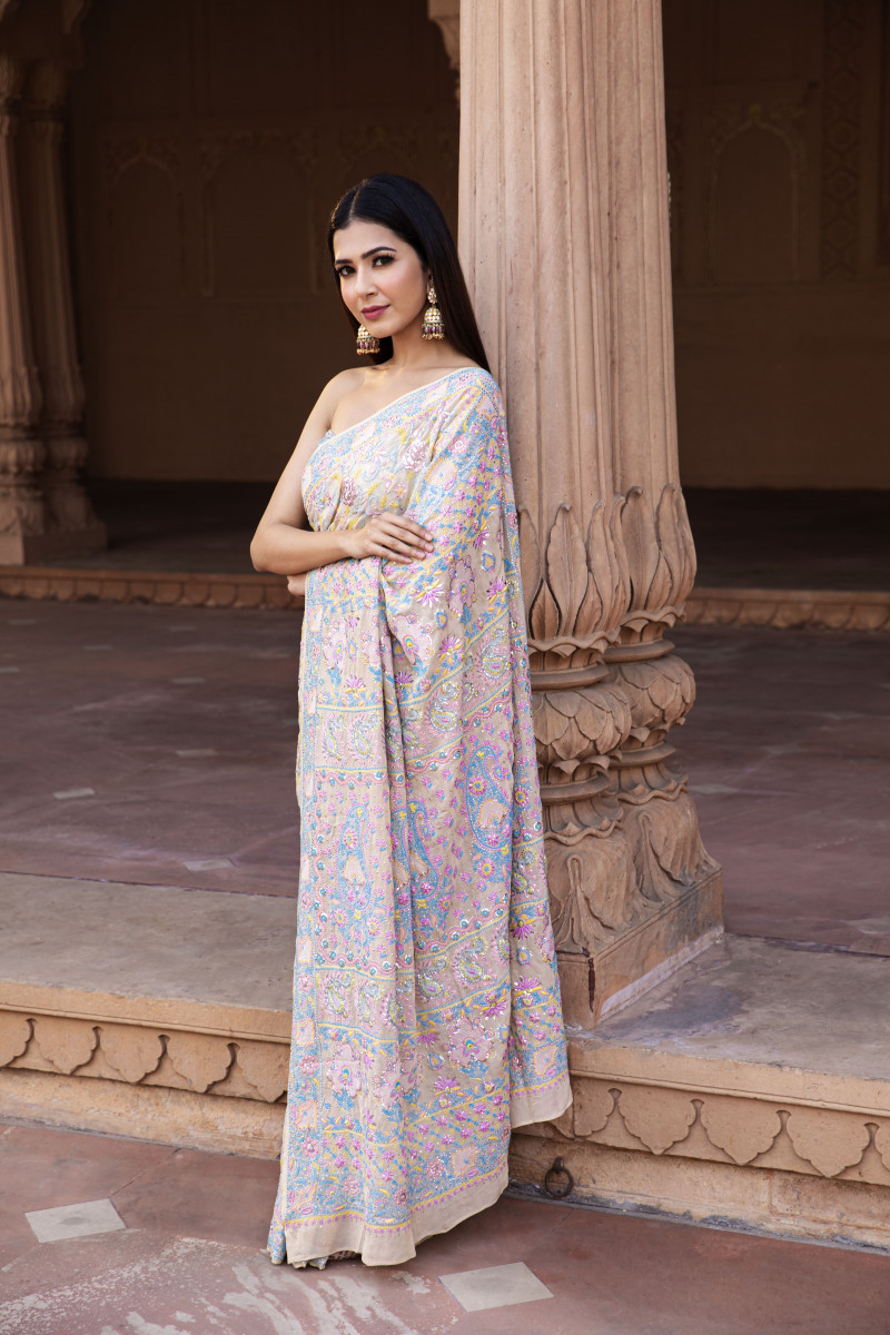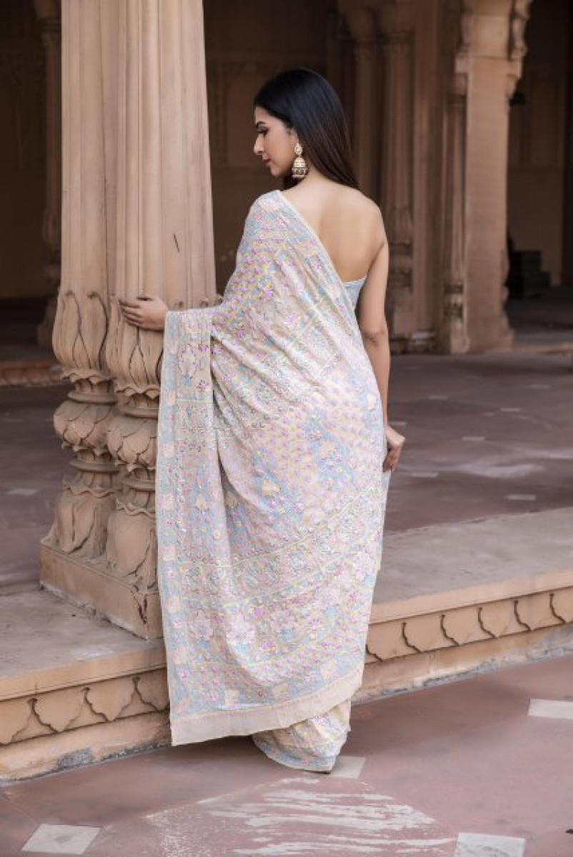 The extended chikankari motifs, patterns, and numerous stitches are the narration of the pristine glorious art form. The soft tones of aquamarine, lavender, and mustard are enriched with royal mukaish sprinkles all over. The Mughal roses with the dense filling of pure mukaish stitches.
