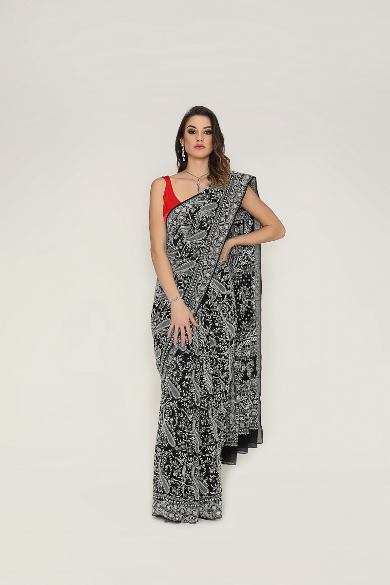 The Classic Black! Luxurious black with scintillating details of Chikankari- ‘Kairi’ motif filled with the essential but extinct Art of Jali-work.This evergreen hand-work took 18 months to our highly skilled karigars to refine the beauty of white thread over the Black canvas.