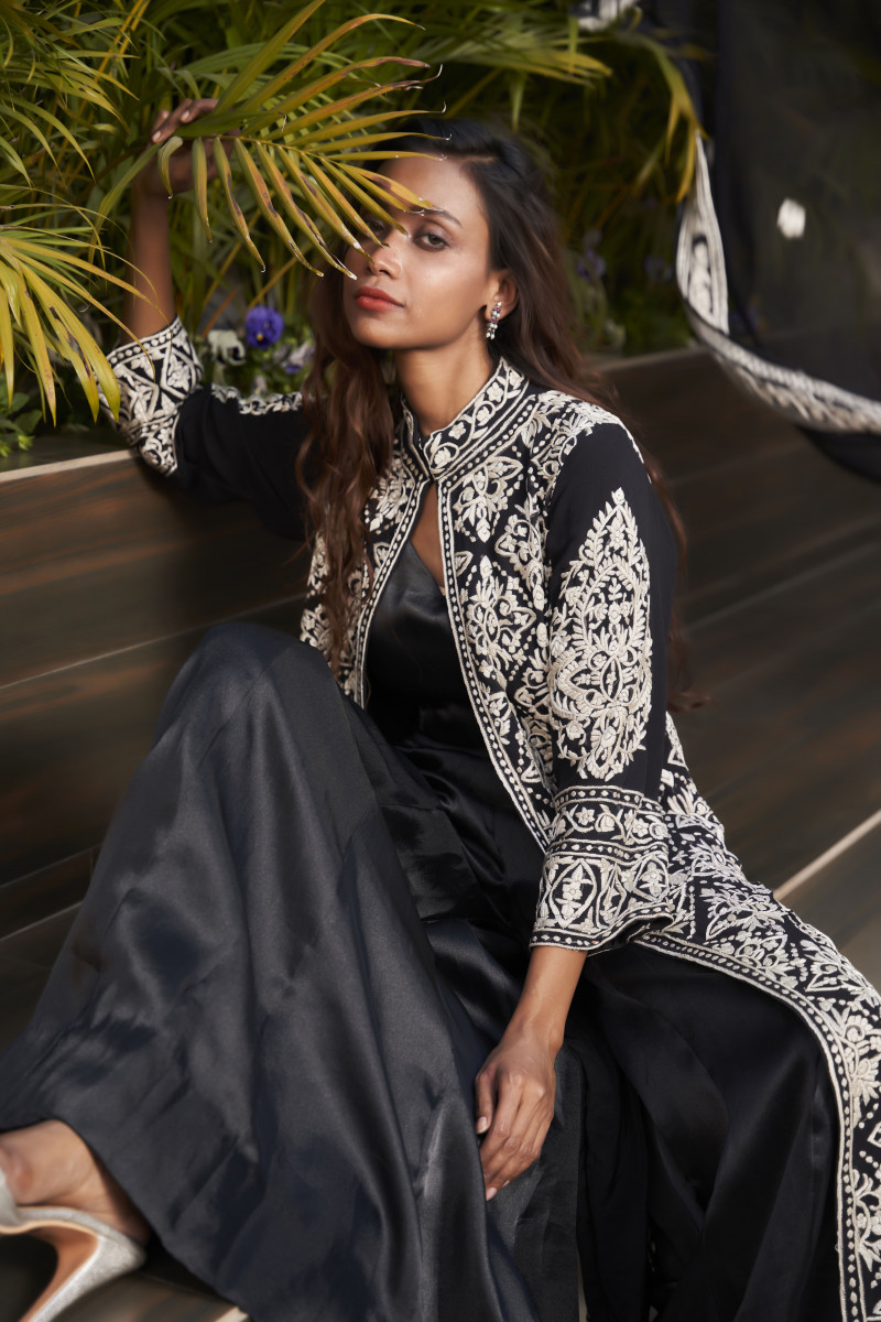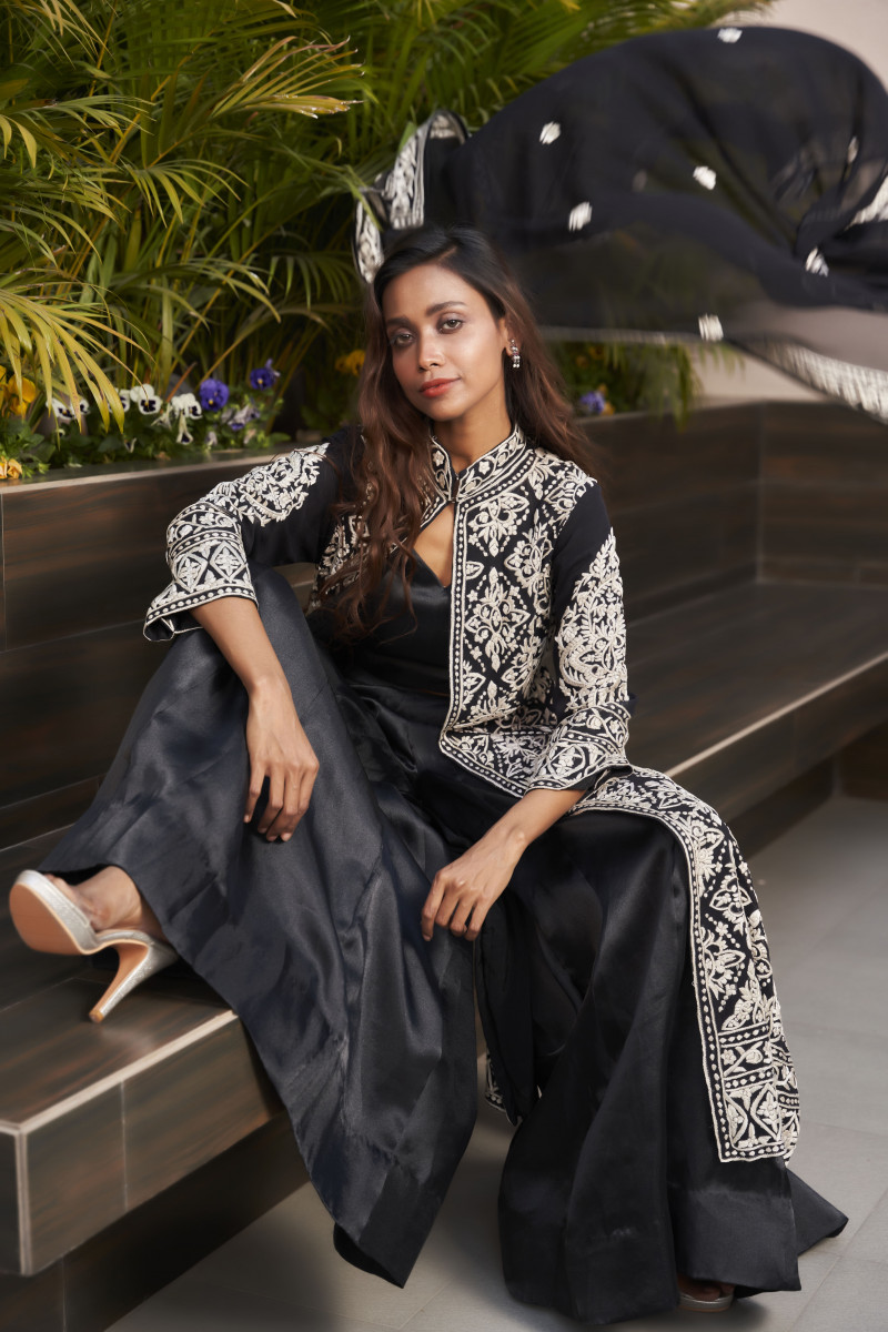 Includes- Embroidered Parsi Gara Dupatta, Jacket paired with bustier and palazzo.