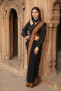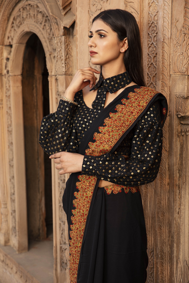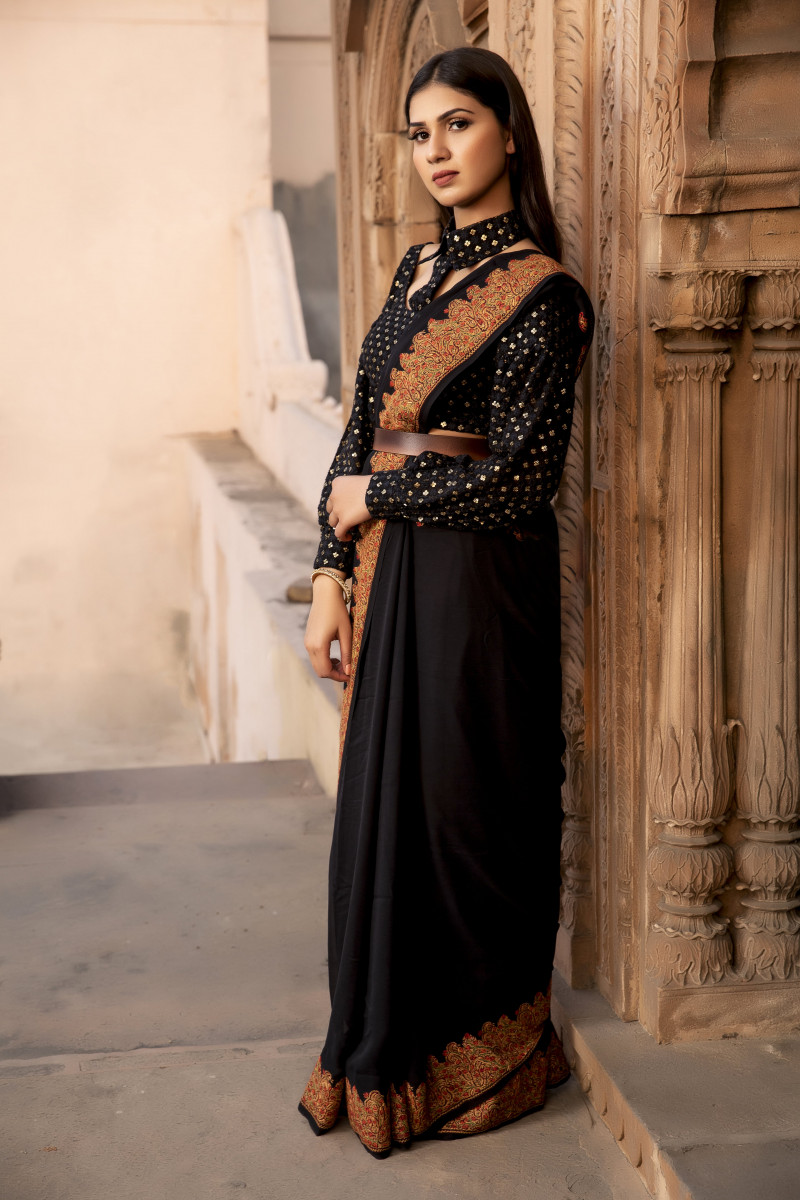The most classic modest attire, that too in the black. Excellent needlework on an age-old jamawar pattern in the shades of rust threads over a timeless silhouette- Saree.