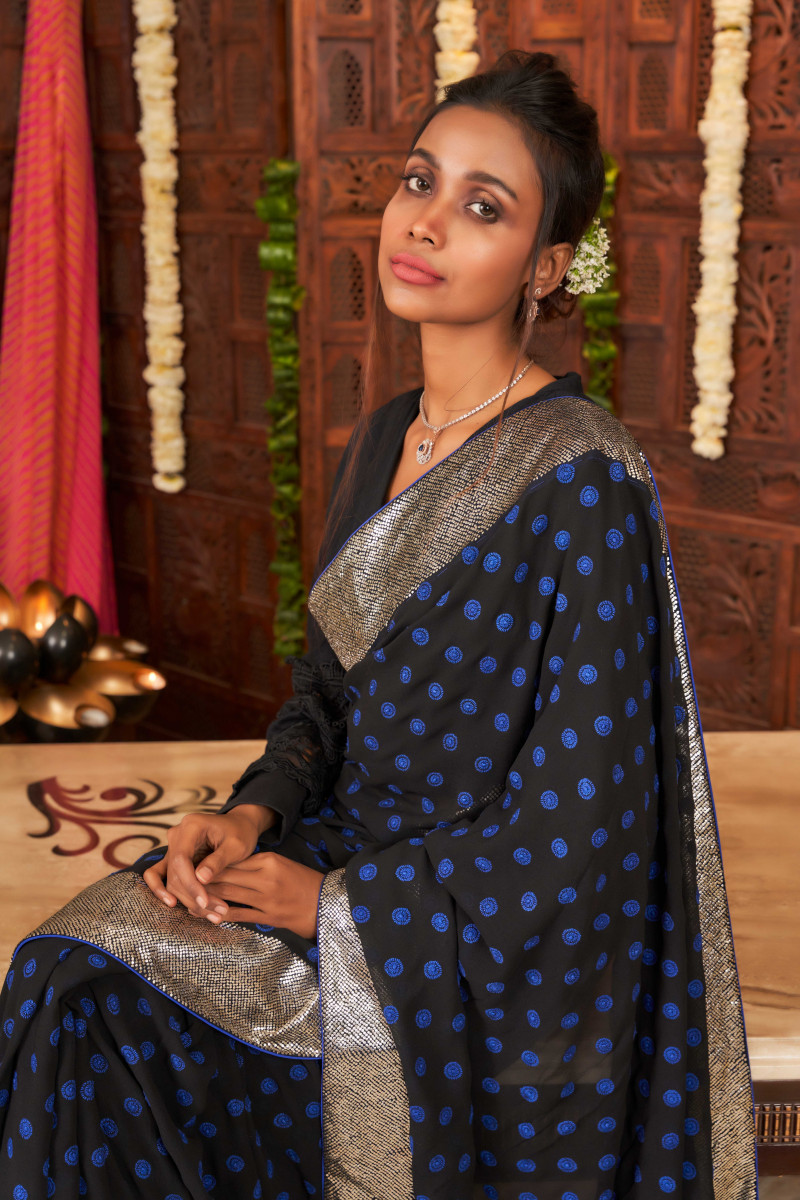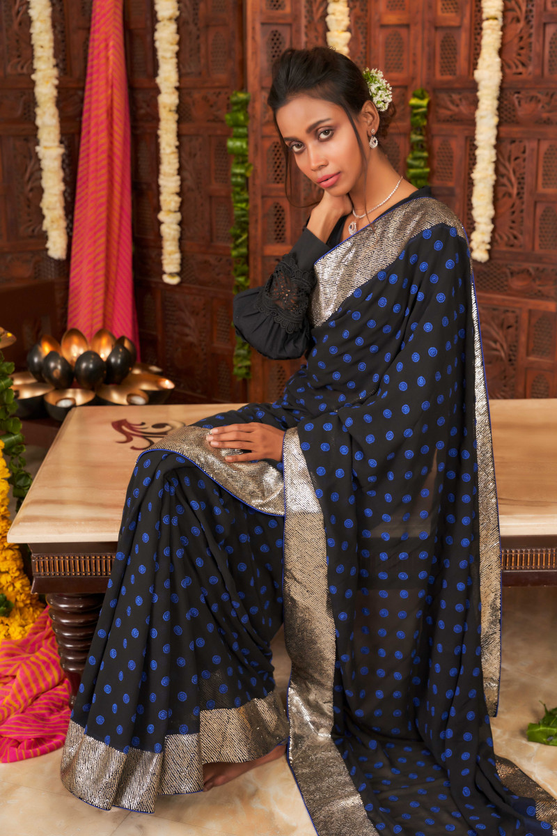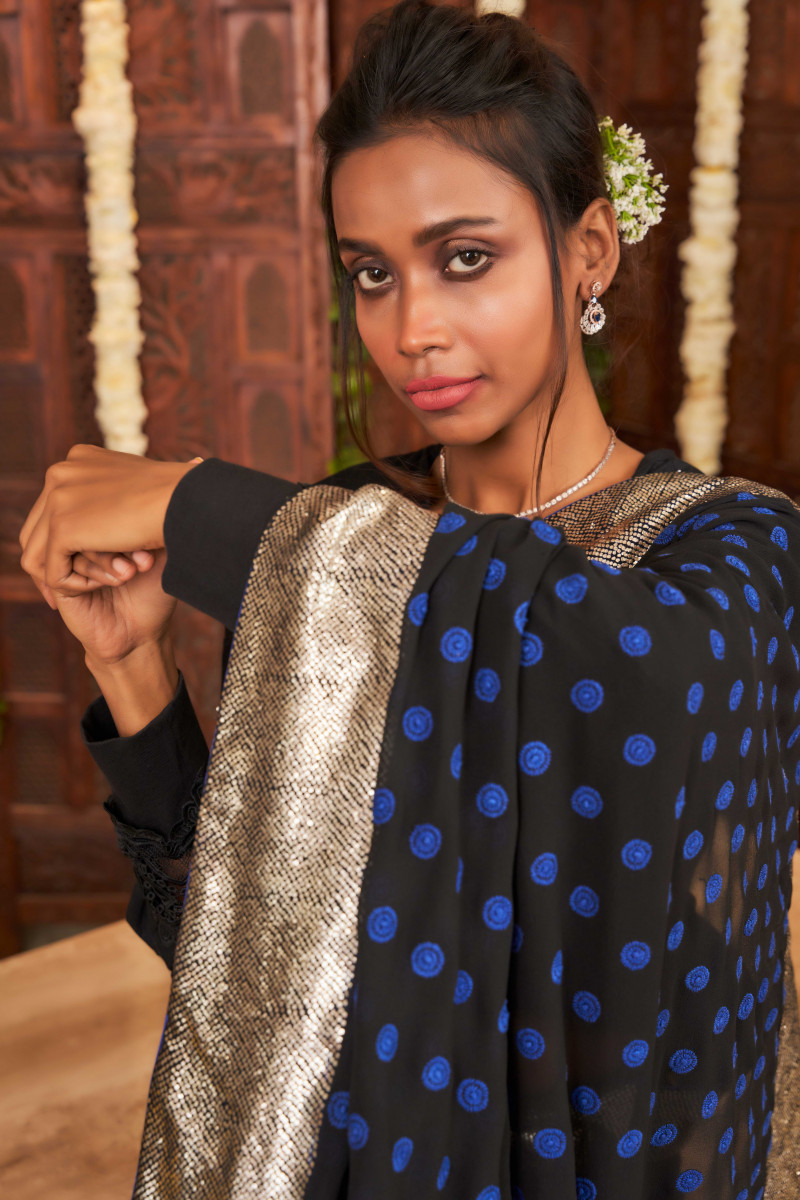 This timeless elegance is crafted in pure georgette. The contrasting blue Kangan Chikankari work all over the saree with Kamdani border makes this saree perfect for any occasion. The blue blouse embroidered with black motifs adds to the charm of the saree.