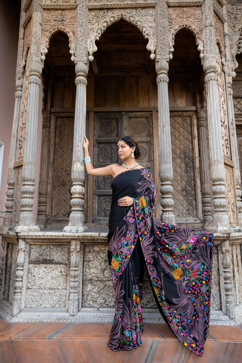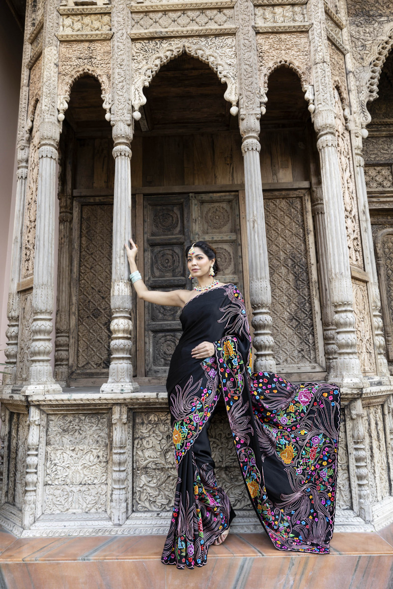 Introducing our mesmerizing Black Signature Lotus Saree, a true masterpiece that will leave you spellbound. This saree is adorned with the most exquisite and intricate Petit Point embroidery, each delicately crafted flower showcasing the incredible dedication and skill of our artisans. Prepare to be amazed as you witness the breathtaking beauty of this saree. Countless hours of meticulous craftsmanship and passion go into creating each individual flower, resulting in a design that is nothing short of extraordinary. As you drape yourself in this extraordinary piece of art, you pay homage to the generations of skilled artisans who have honed their craft over the ages. Our label stands as a testament to their exceptional artistry, and this saree is a shining example of the legacy they have created. Indulge in the allure of this saree, as it effortlessly combines timeless elegance with contemporary style. The black backdrop serves as the perfect canvas for the intricate lotus embroidery, creating a stunning visual symphony that is guaranteed to turn heads. Experience the epitome of luxury and sophistication with our Black Signature Lotus Saree. Embrace the exceptional artistry and craftsmanship that defines our label, and make a statement wherever you go.