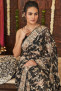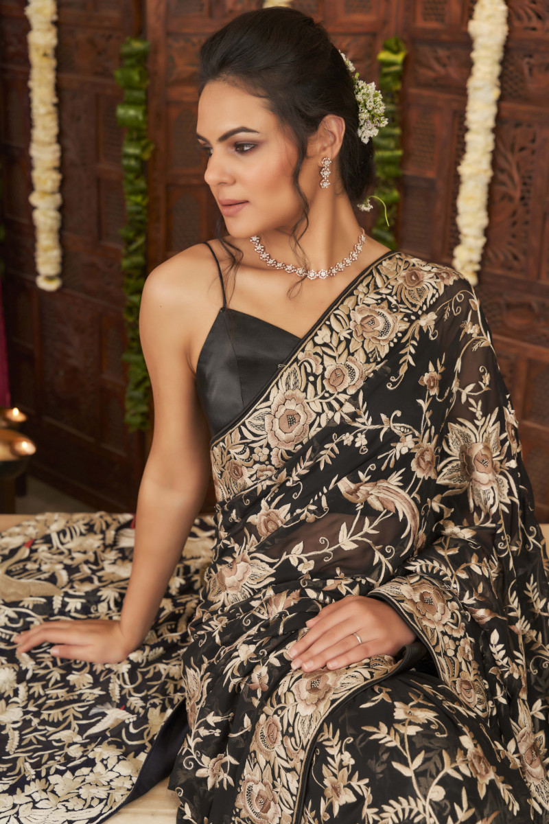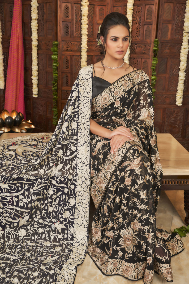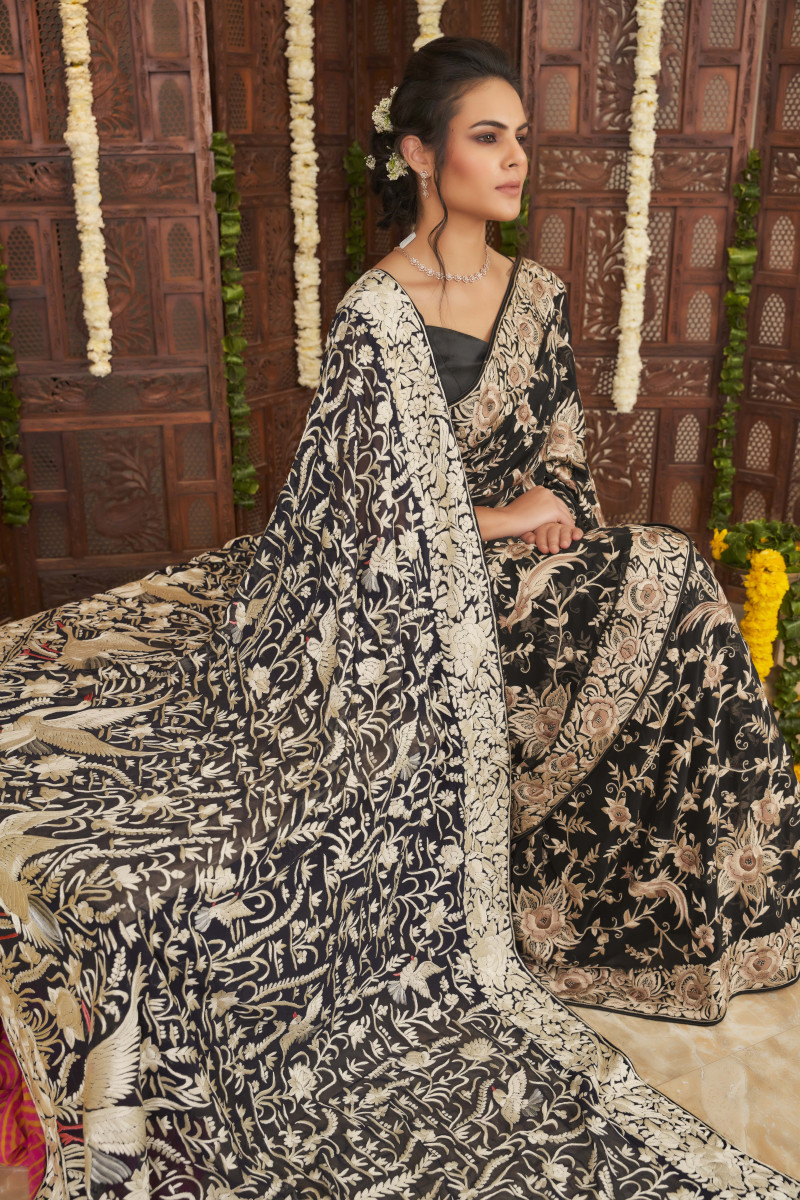 An absolute timeless saree reflecting the picture of glamourous elegance & a breath-taking Black with traditional ivory blooms rising magnificently from its surface to create dazzling glamour. The statement traditional saree flaunts the signature flora & fauna of Parsi-Gara embroidery.