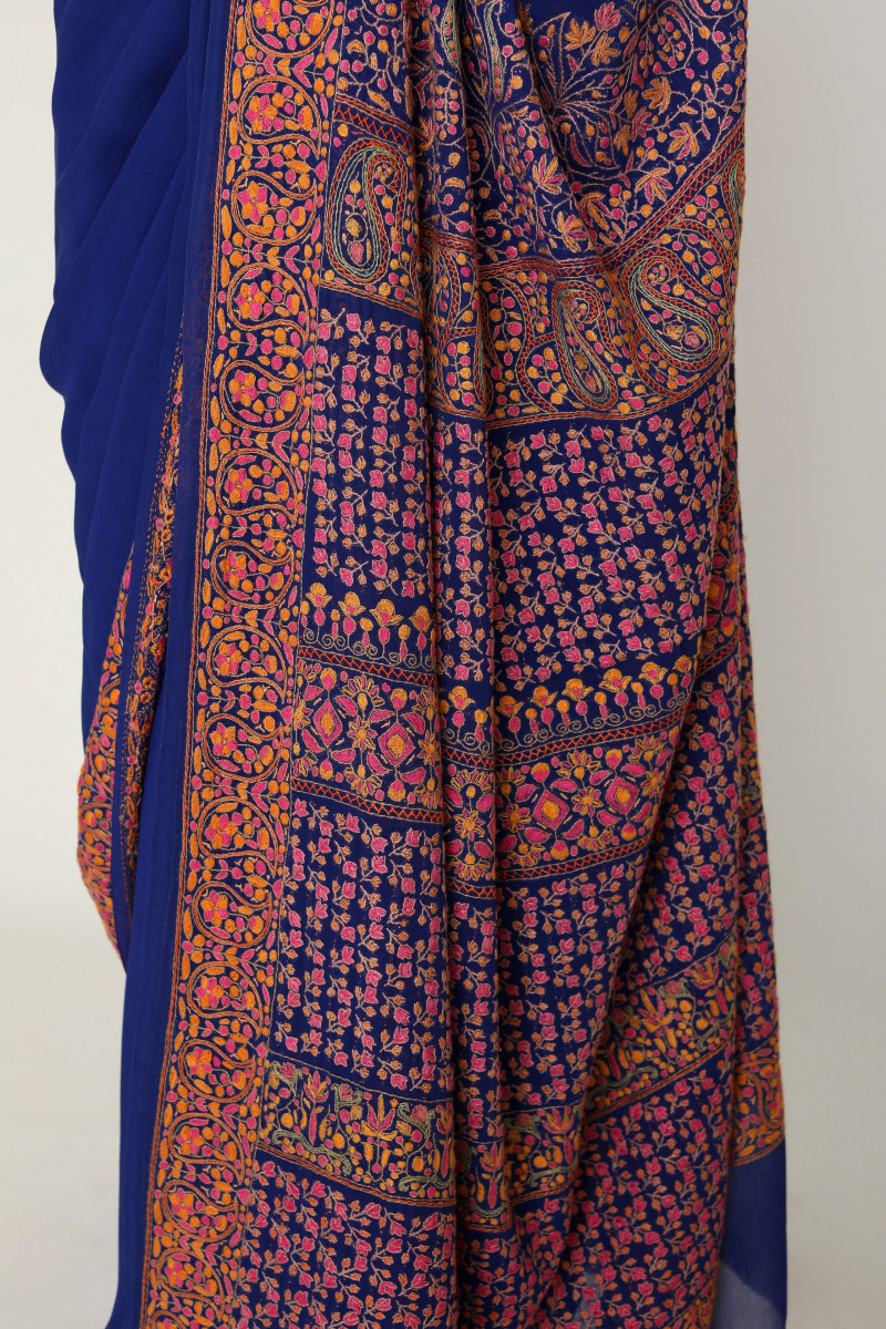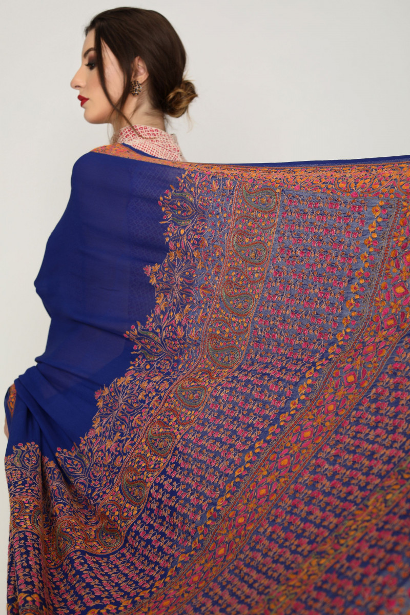 Minimal yet graceful! The Persian blue delicately embroidered with the geometric palette of floral pinks and mustards. Perfect for today’s women who love Modern ethnicity.