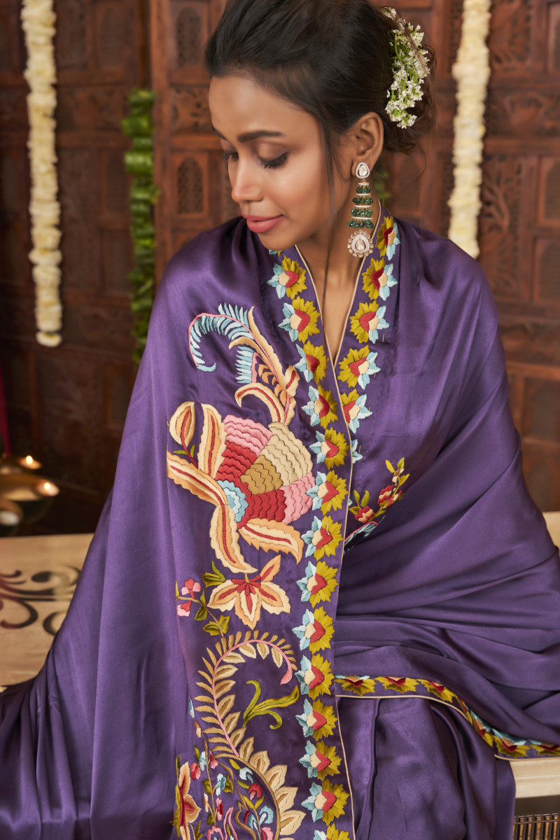 Created in pure satin, our purple saree is a saga of bold flowers embroidered beautifully all over the pallu. We bring to you a traditional Parsi Gara in a contemporary style.