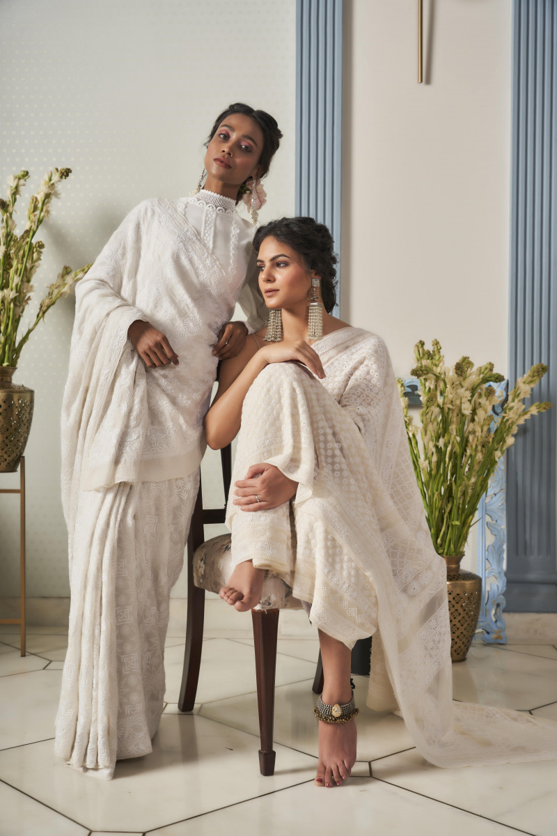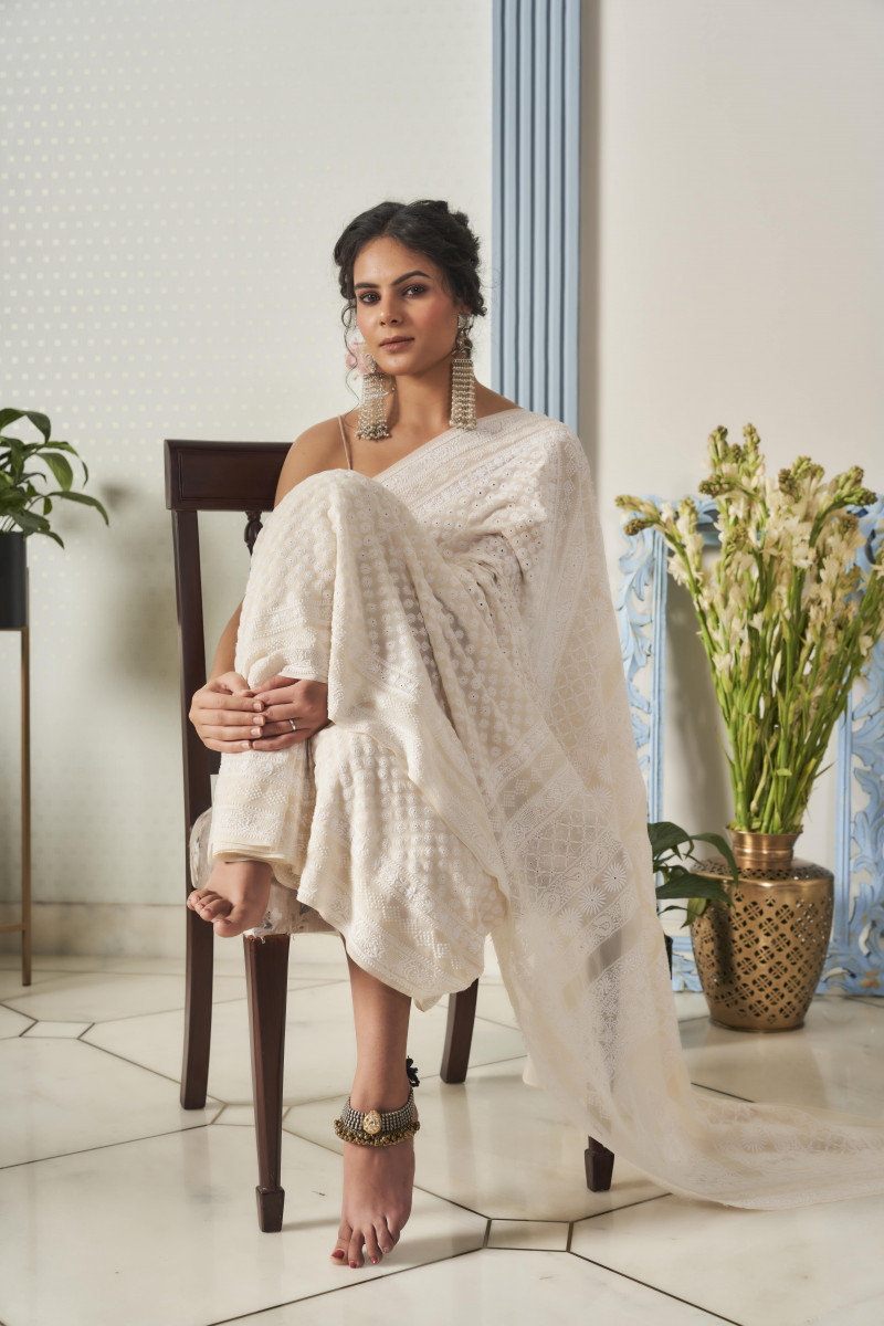An utterly romantic drape lavishly defined with the most significant & indispensable motif called “Kangan” of chikankari. The all-over surface of the saree is embroidered with delicate cotton yarn. The saree is done to preserve the authentic stitches, motifs & patterns of great Art-Form. The design showcases the contemporary glamour with enrooted essence of traditional craftsmanship.