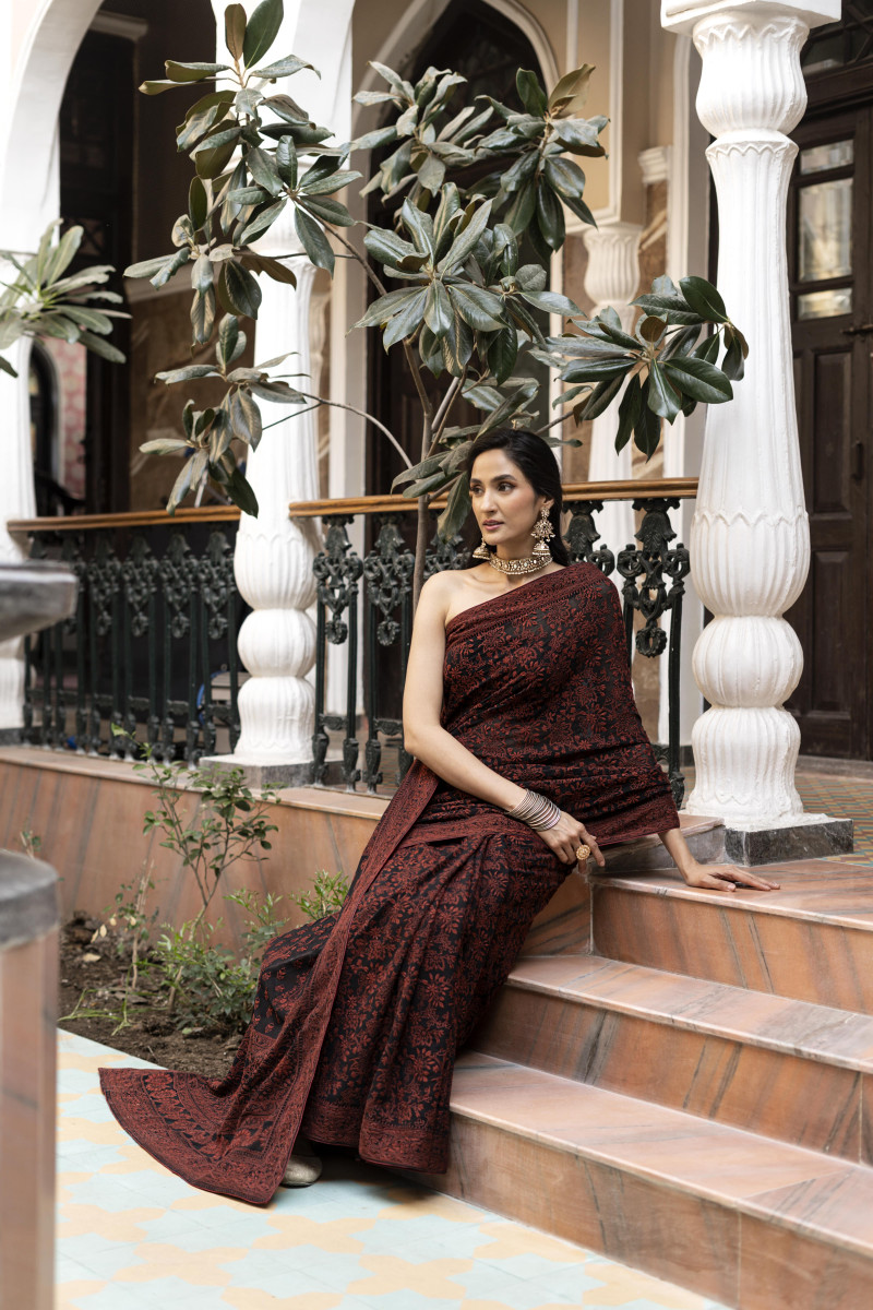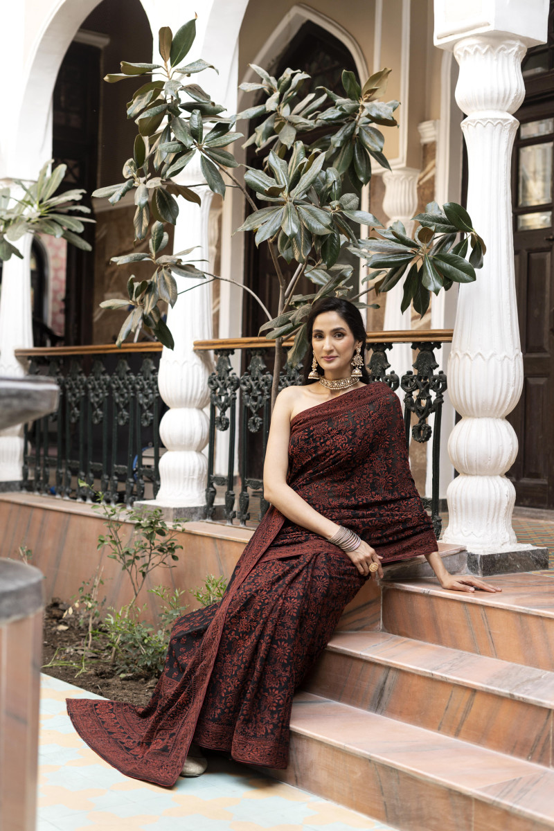 an exquisite black georgette saree adorned with shaded rusty ek taar embroidery. Crafted with utmost precision and care, this saree is a true testament to our talented artisans' exceptional skill and dedication. Immerse yourself in the beauty and luxury of this ensemble, where every thread and stitch has been meticulously handcrafted over a span of 17000 hours. Each intricate detail showcases the mastery of our karigars, ensuring that this saree is not just a garment, but a work of art.