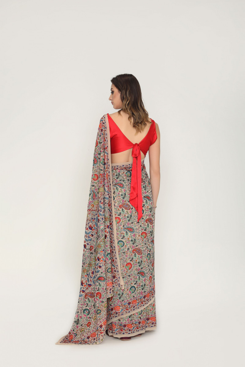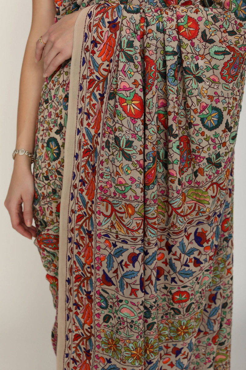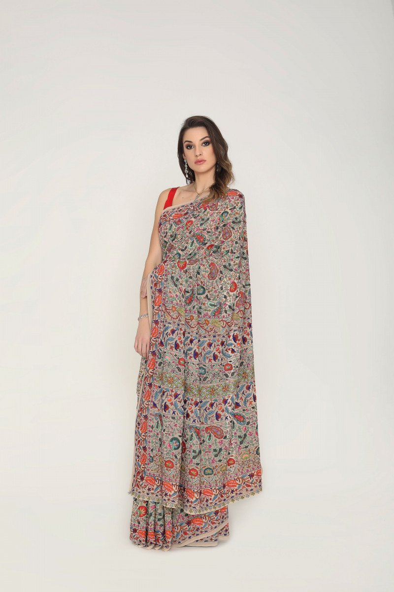 Magnetizing elegance! Ek taar Kashmiri embroidered saree with the finest Motifs & patterns inspired by the flora of divine Kashmir. Perfect for classy women, who celebrates the Significance of authentic glory.