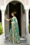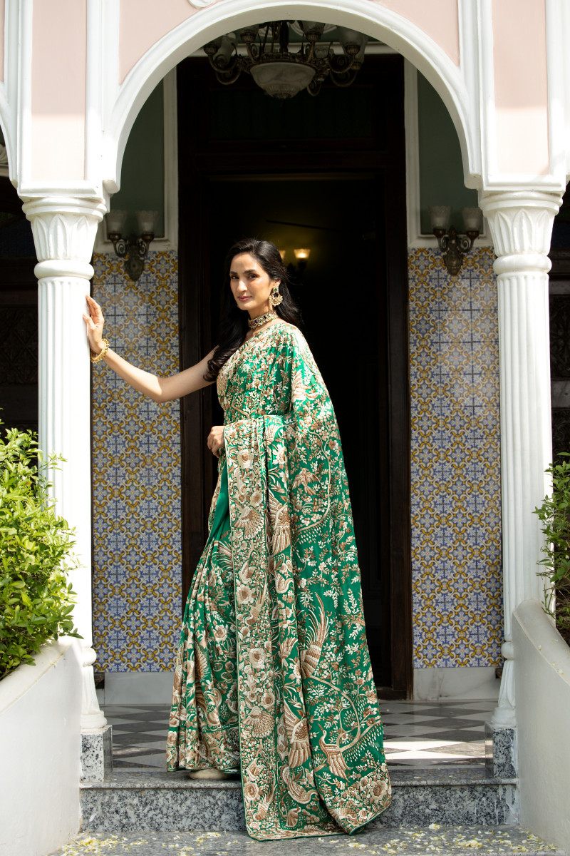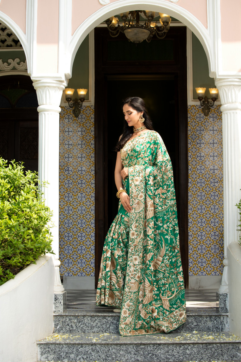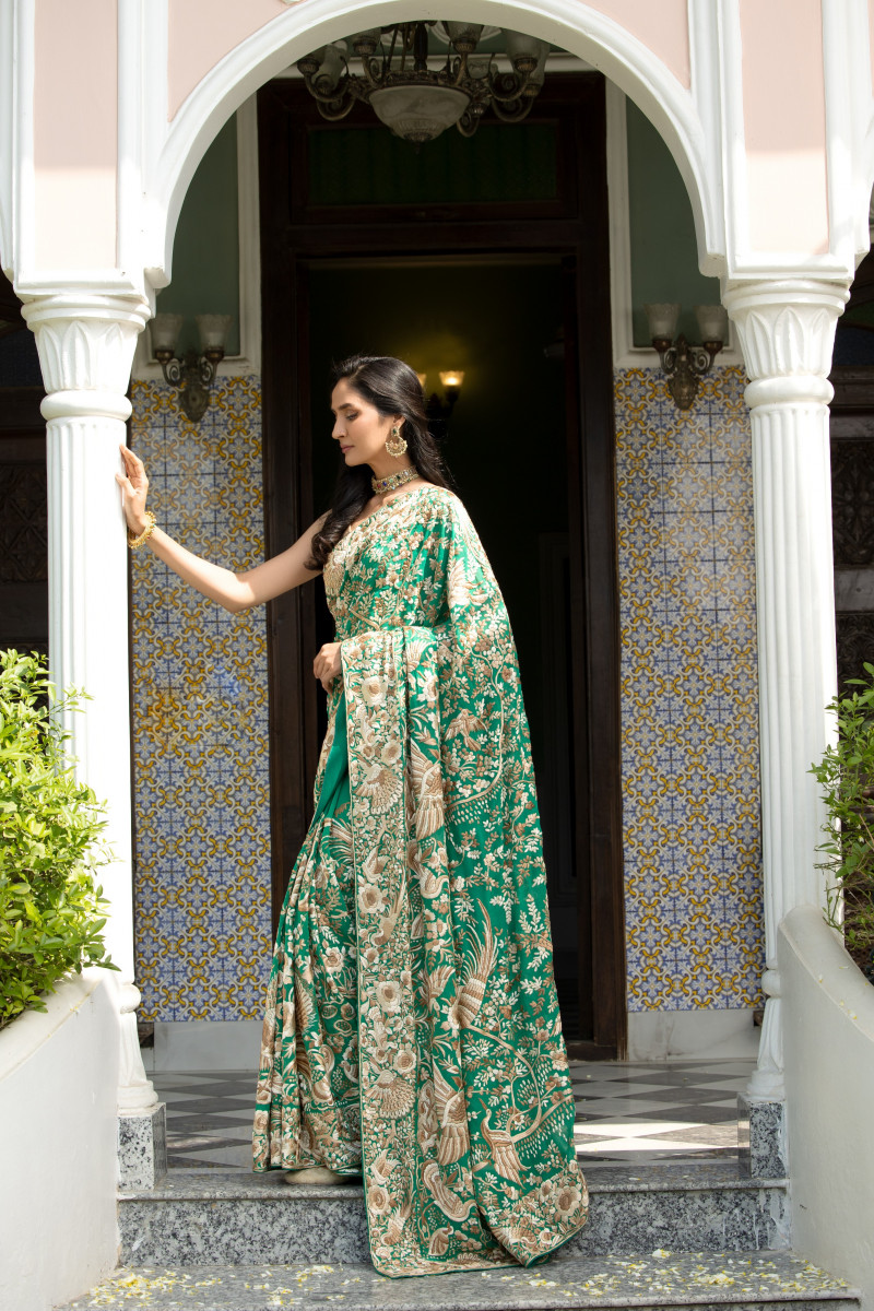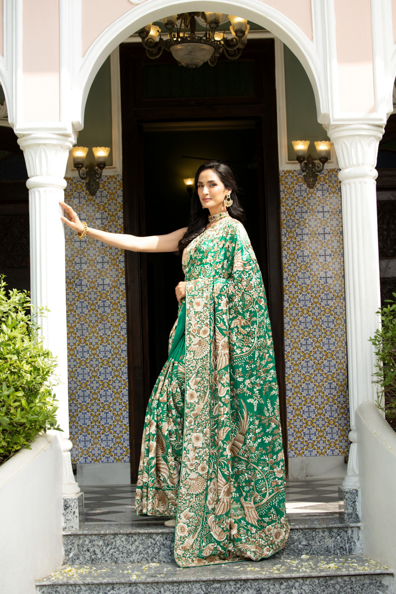 A one-of-a-kind Green Parsi Gara saree, adorned with exquisite flora and fauna motifs throughout is truly a dreamscape by the masterful artisan. This saree tells a tale of Indian heritage and is a marvelous quintessence of embroidery, art and history.