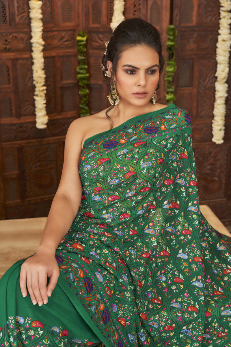 The beautiful hue of green, embroidered with the multicolored threads using the age-old techniques of paper machier narrates the story of the unparalleled efforts and dedication of the craftsmanship. This saree is a Kashmiri treasure, a timeless piece passed o to the next generation.
