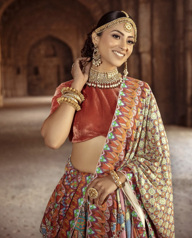 This treassured jewel, has been carefully designed in a colour palette inspired from the magnificent Sri Ranganathaswamy Temple Srirangam .