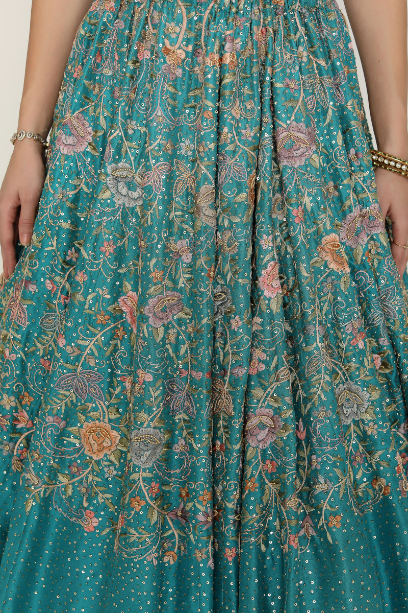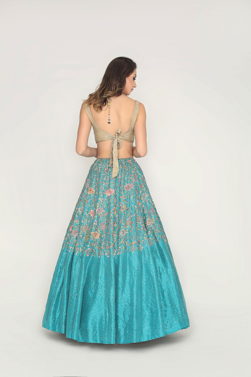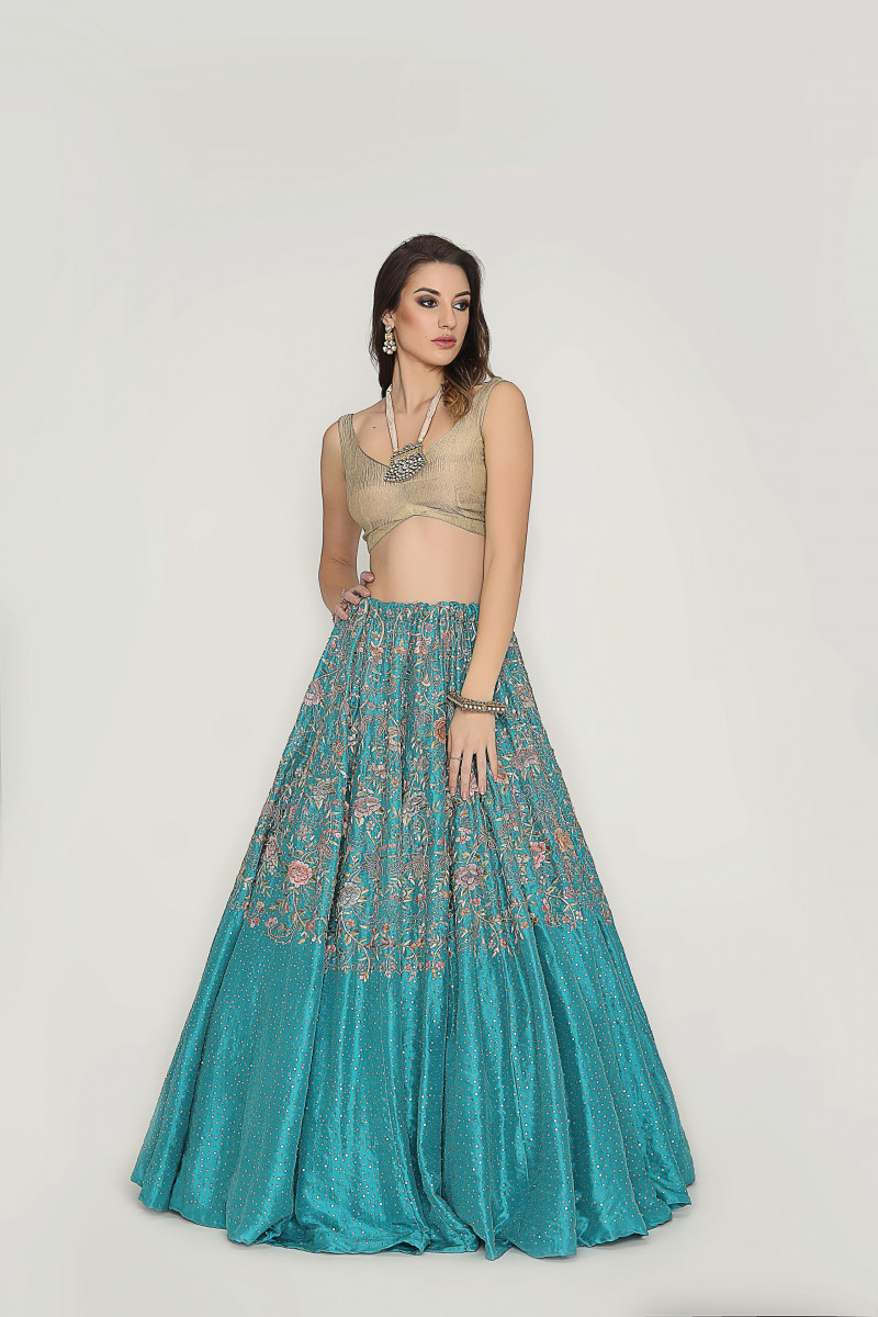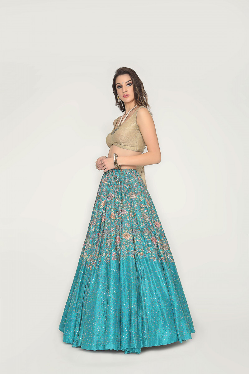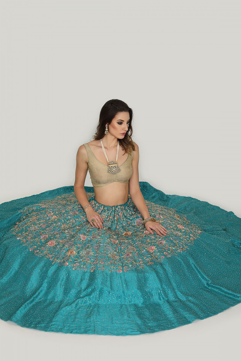 A contemporary Parsi-Gara Skirt Depicting the pastel floral creepers from Mughal miniature art. Achieved through exquisite sequin Embellishments. Just perfect to a part of the bridal trousseau & for pretty bridesmaids.