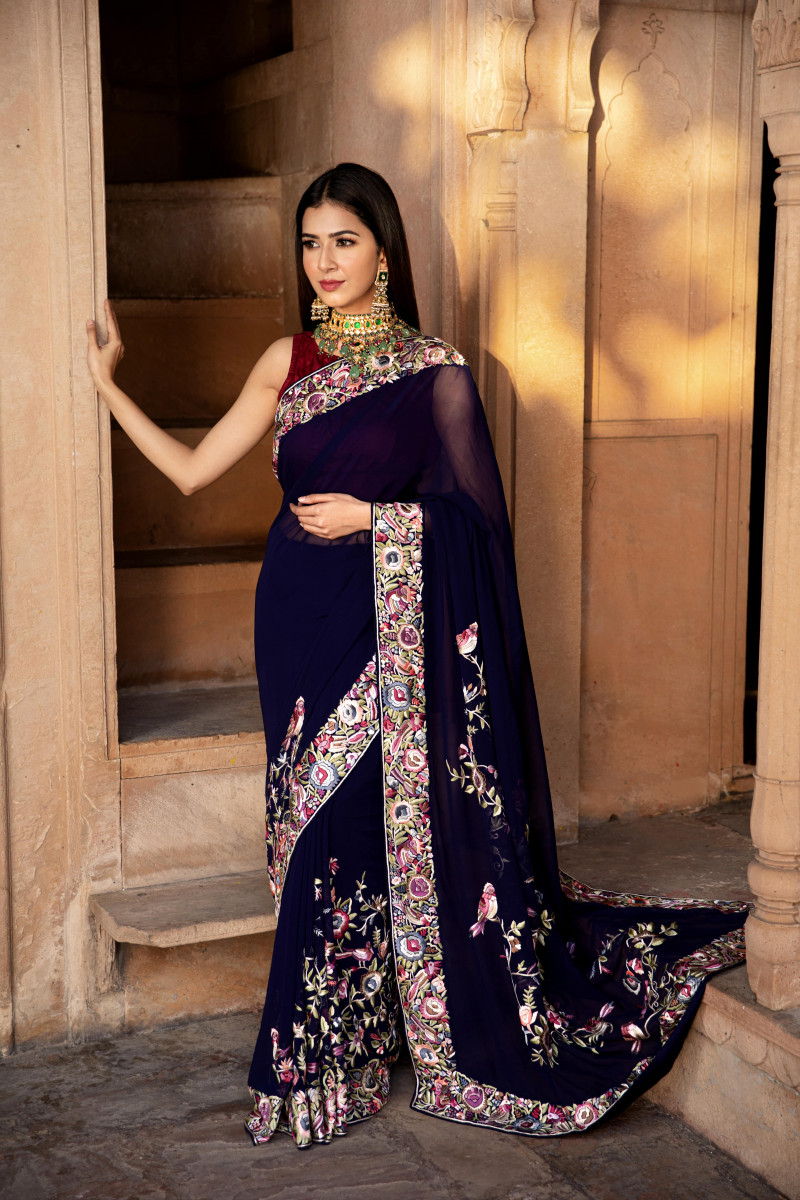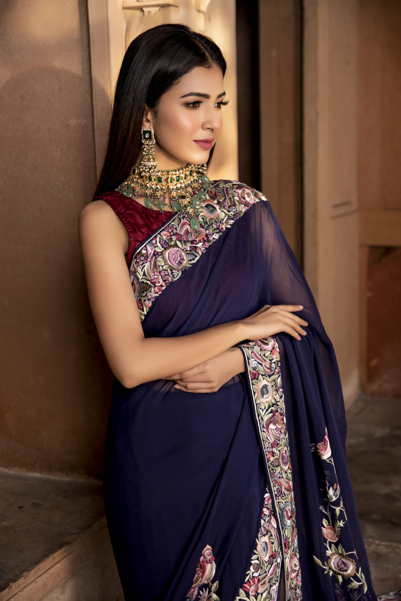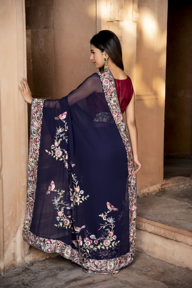A midnight blue timeless Parsi Gara saree with multi-traditional Parsi flora and Fauna.