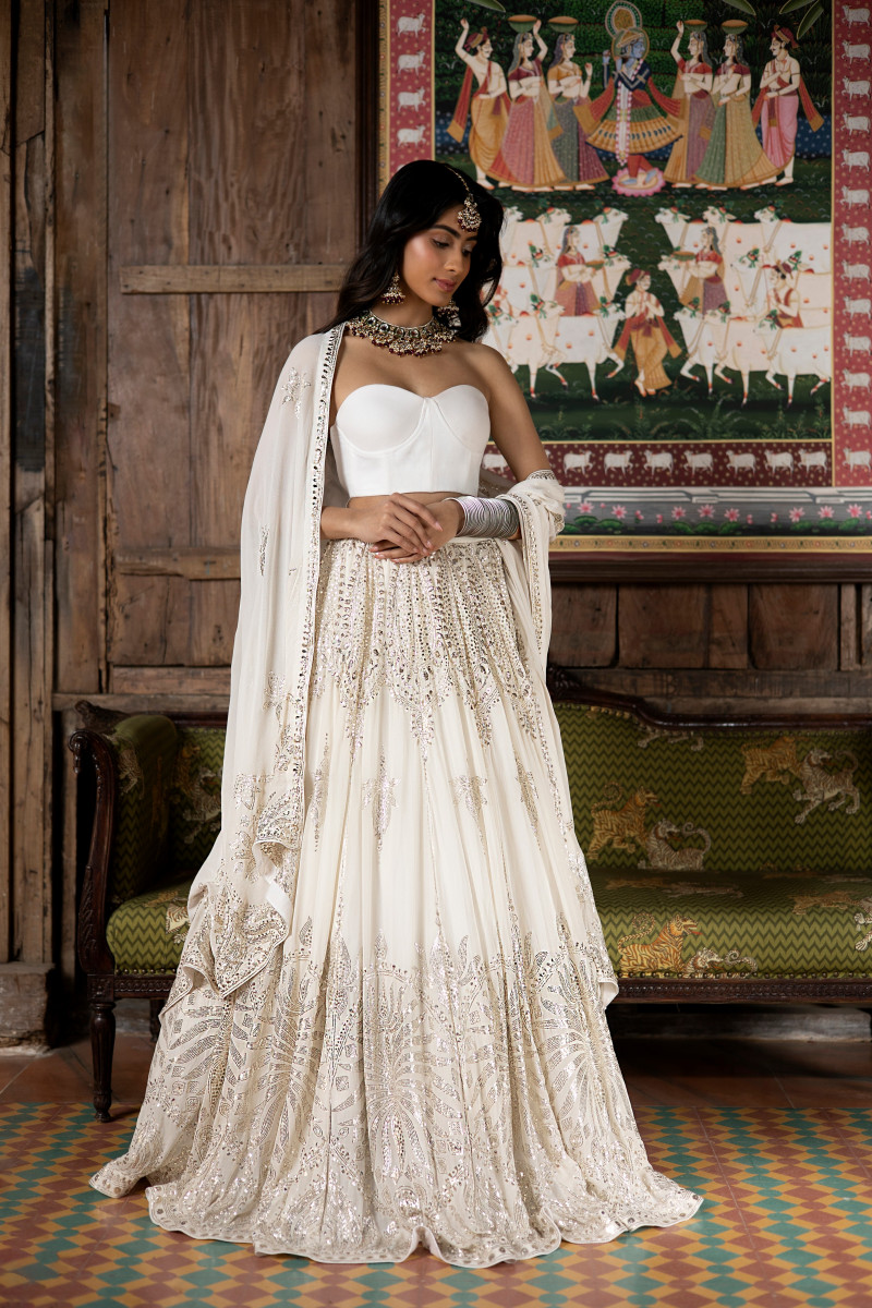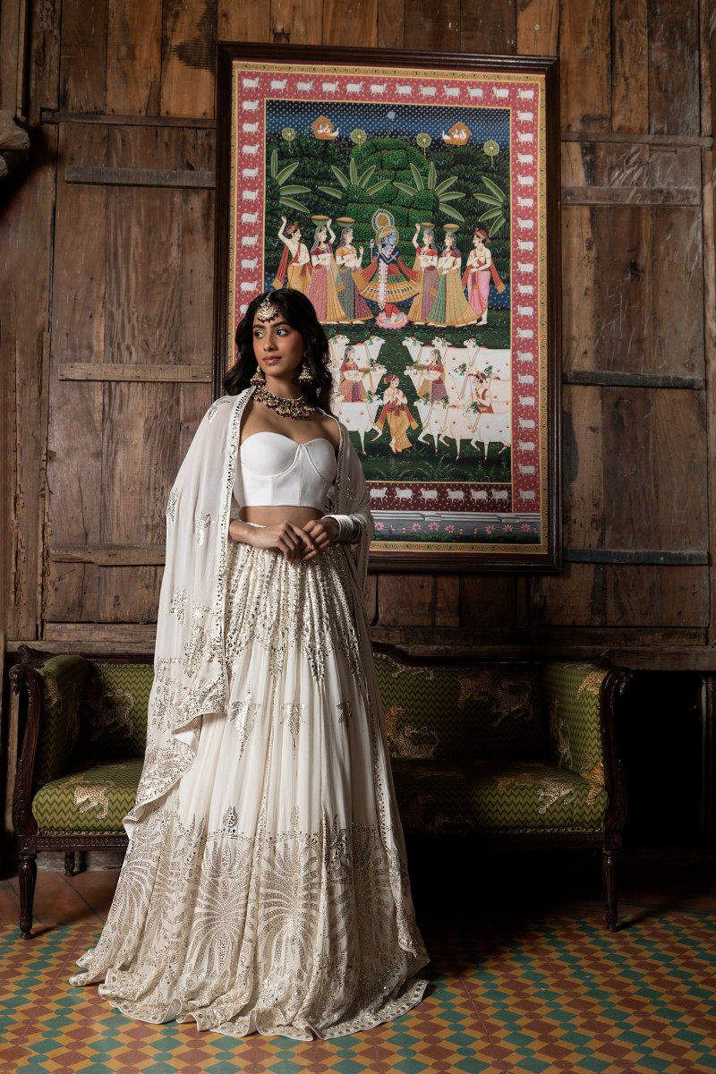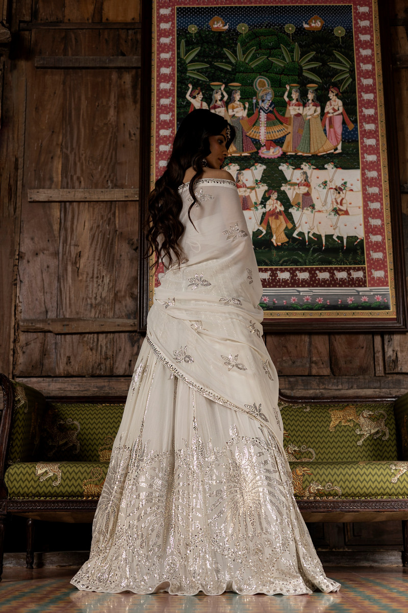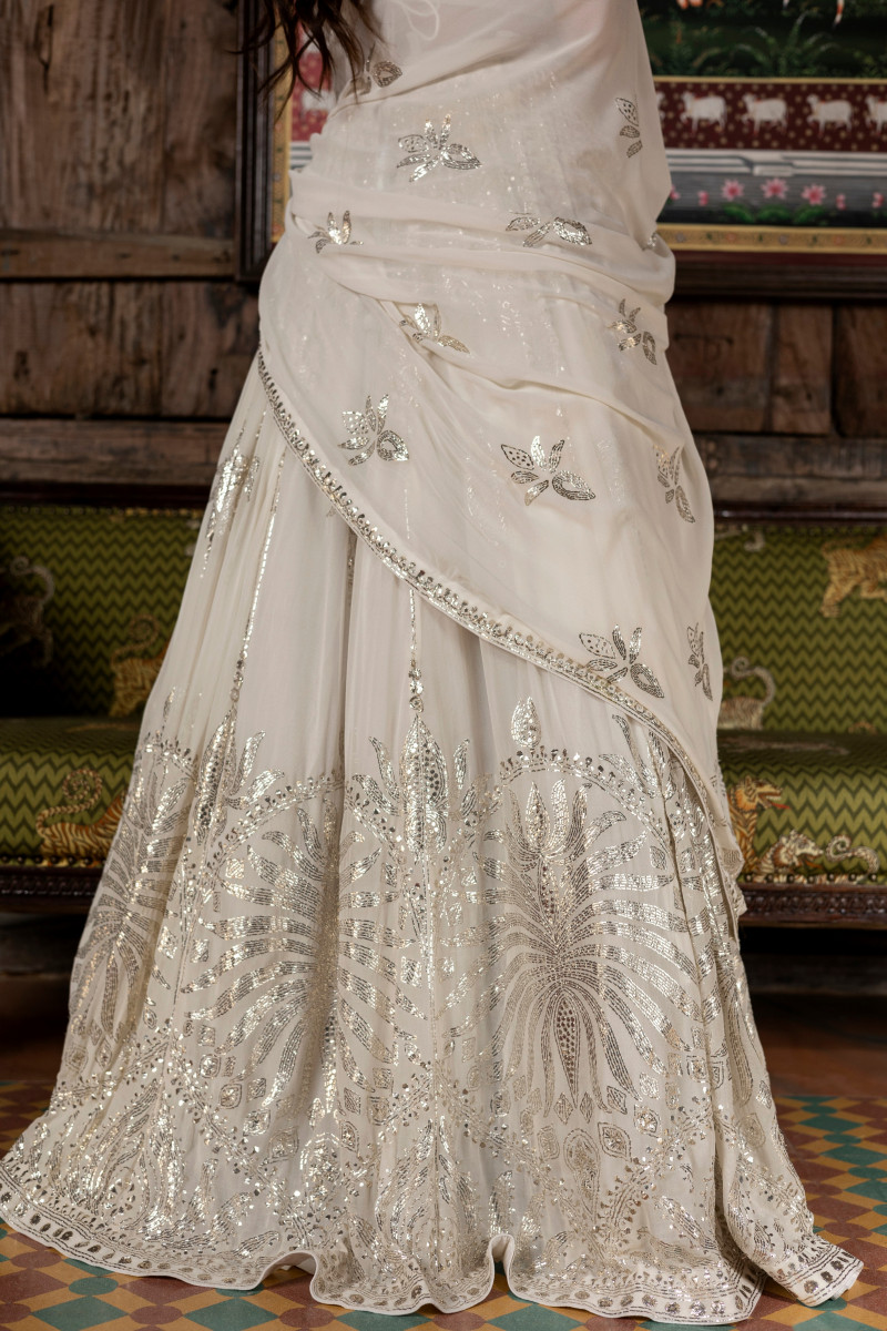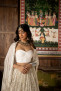 Featuring our exquisite Mukaish Lehenga, crafted with enduring artistry and adorned with a shimmering blend of gold and silver. This opus emanates a majestic charm and radiates an aura of perpetual refinement.