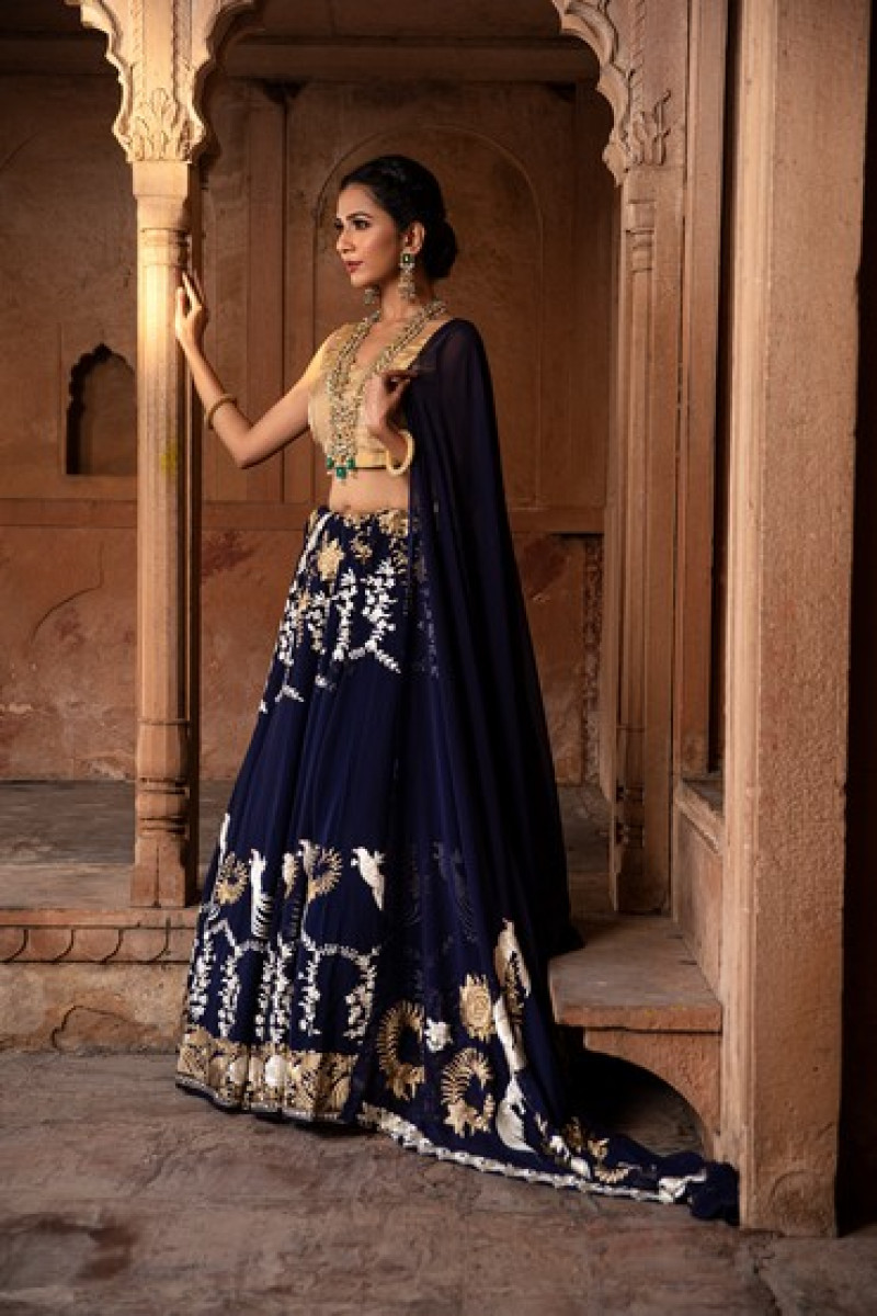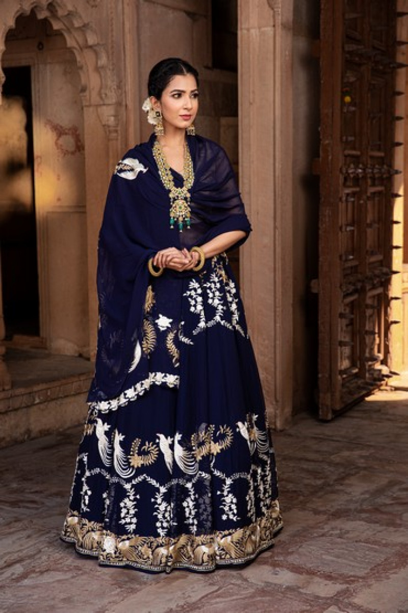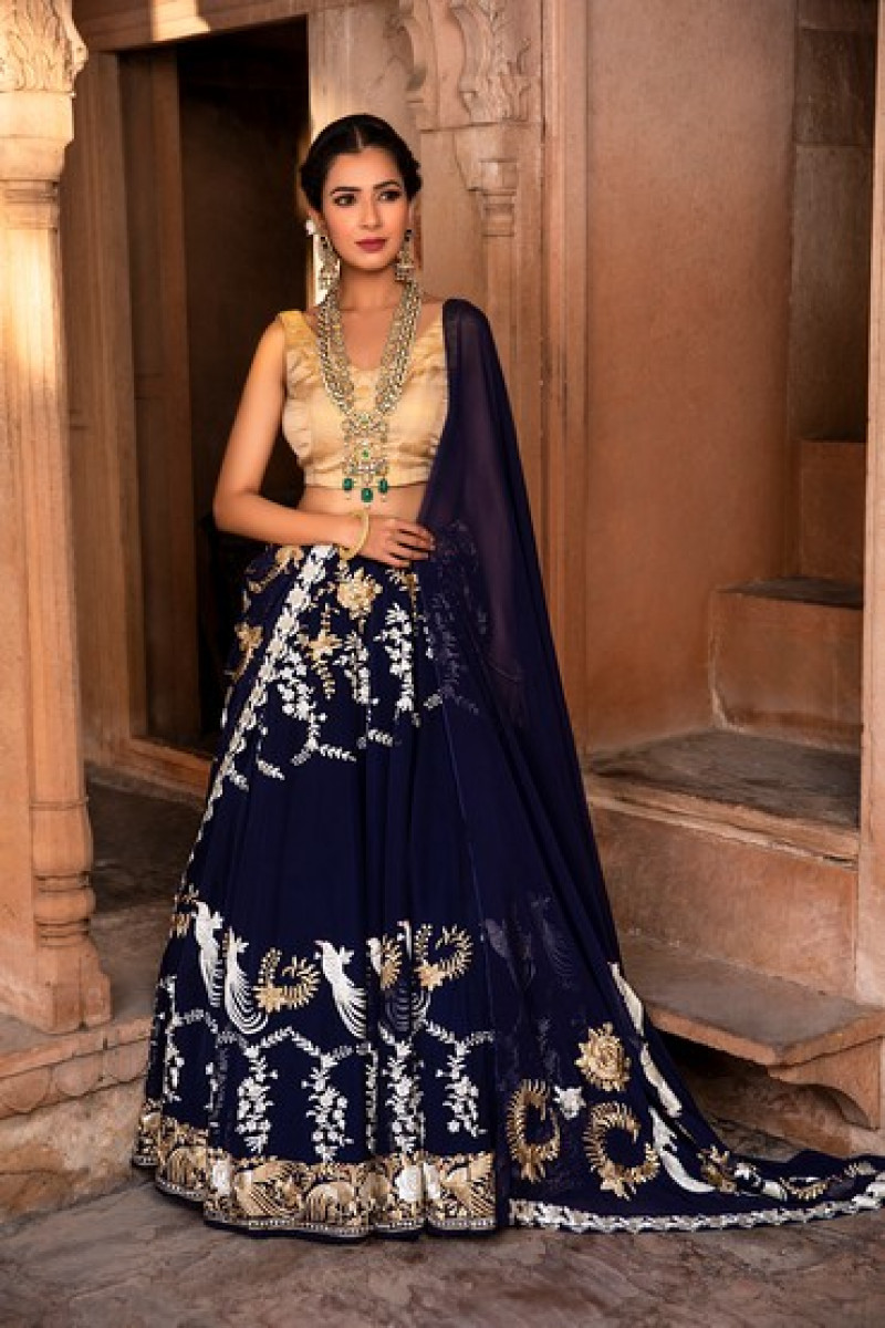 Includes- Heavy embroidered Navy blue blouse fabric. which can be customized as per your size & Requirements