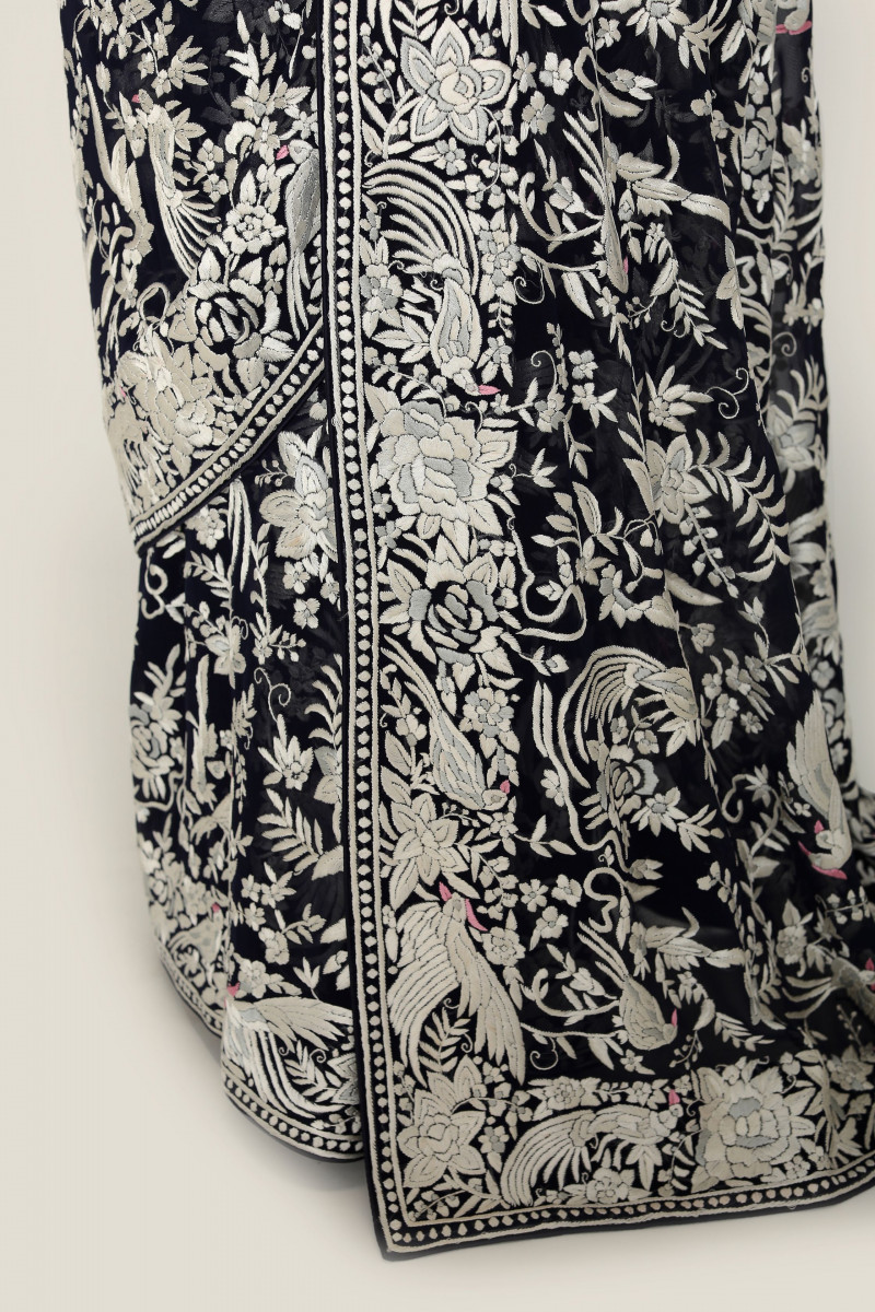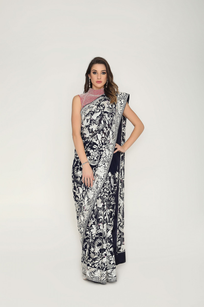 Authenticity personified! Midnight ocean shining with the glow of Snowy birds of Paradise. The perfect match for the women who want to flaunt her Royal Chic.