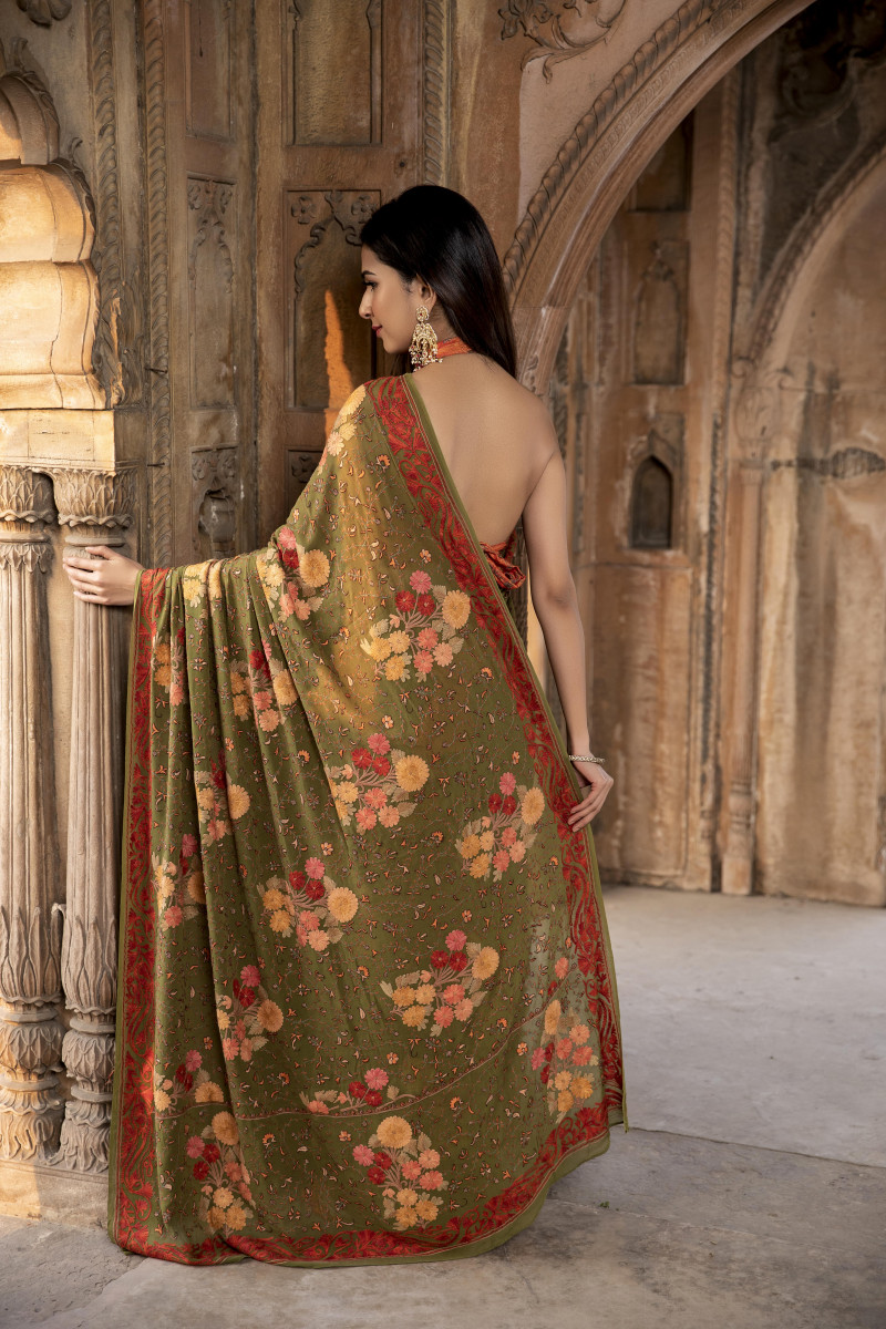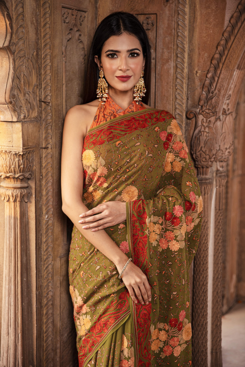 Autumn floral bunches beautifully crafted with rusty leaves jaal. Exquisite artwork imbibing the Kashmiri crafts and beauty of Kashmir. Best choice for winter wedding-festive season.