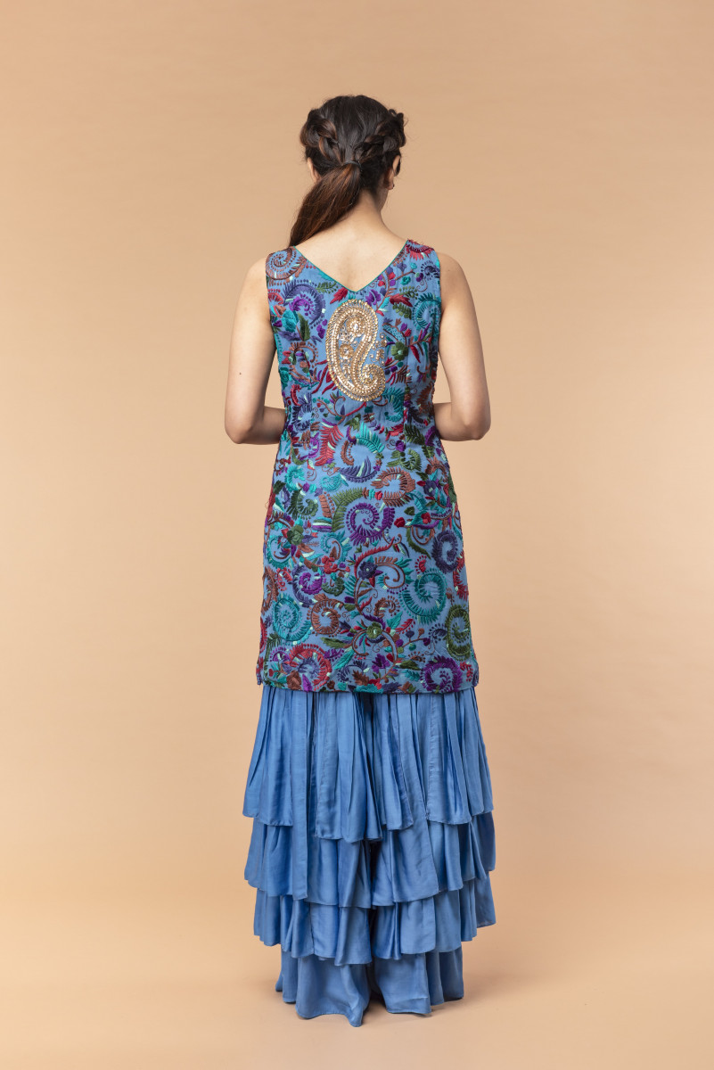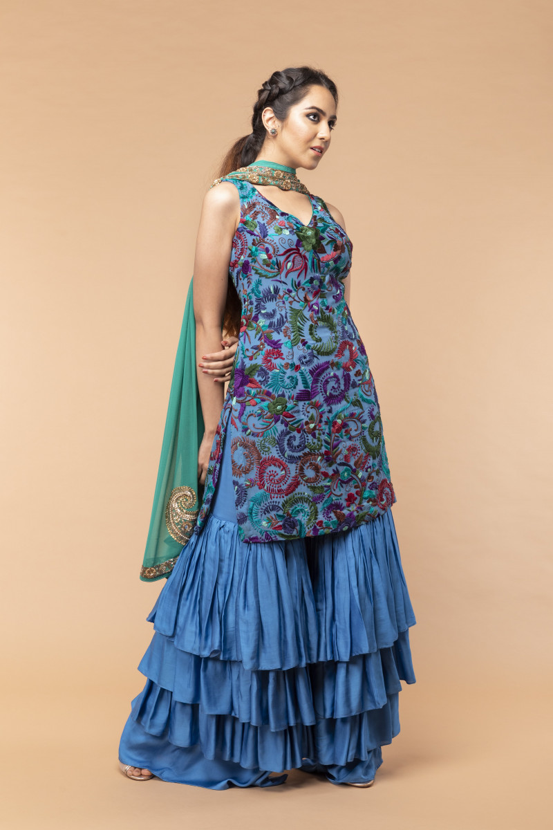 A Parsi Gara sharara with bold intricate flowers allover teamed with a halter neck crop top.