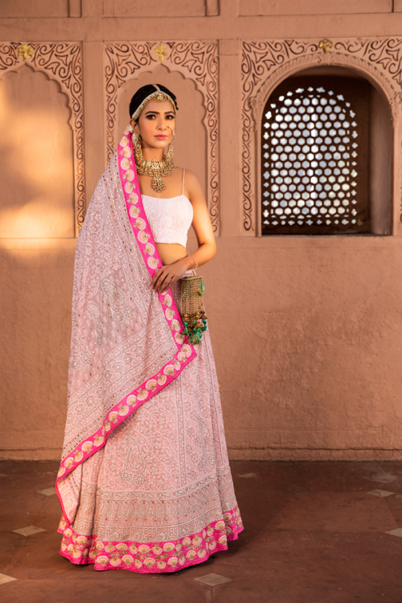 The most sought after chikankari & the classic Bridal ensemble defined & decorated with the white threads of authenticity. The enhancement of silver cutdana and pure royal Mukaish are adding a rich sheen to this elegant bridal outfit.