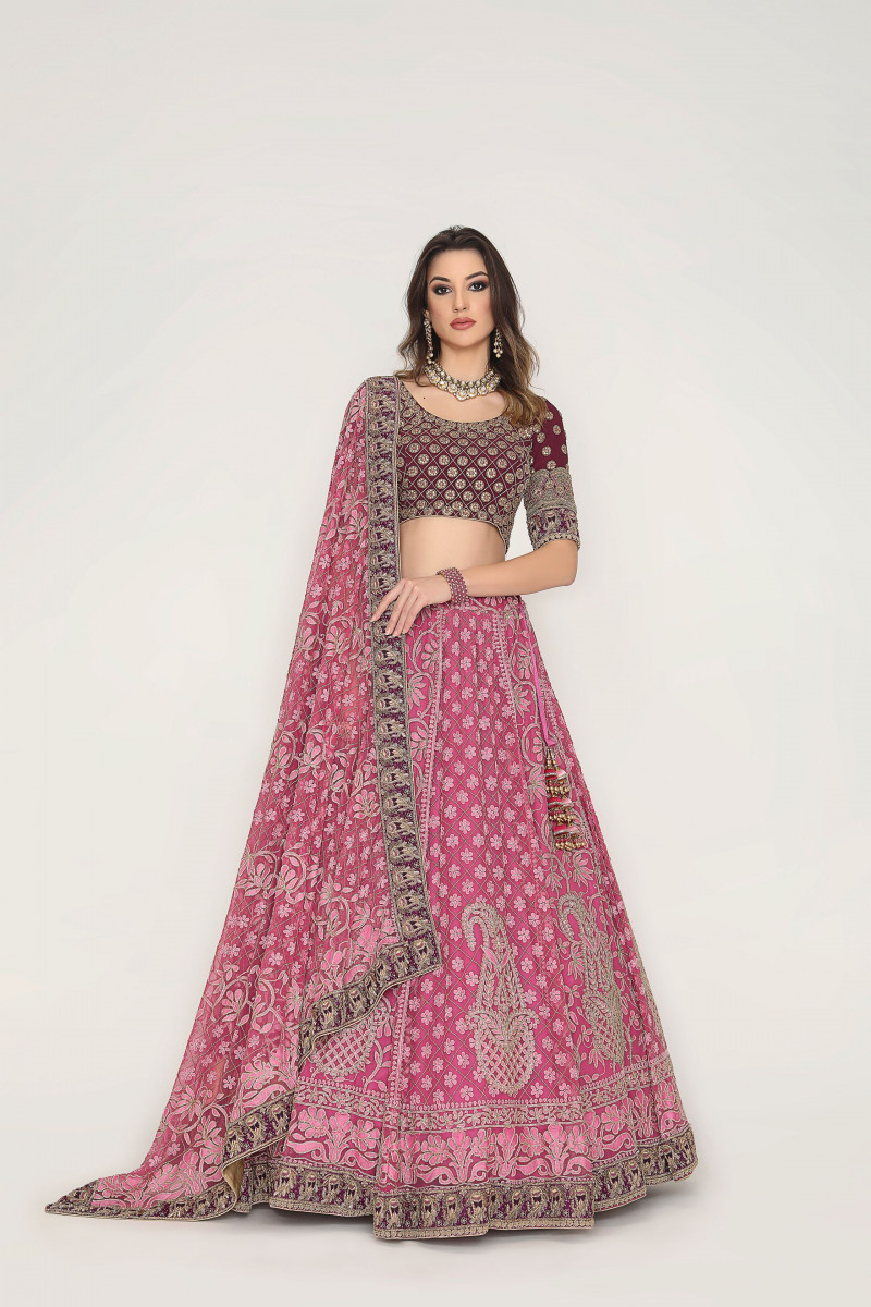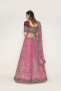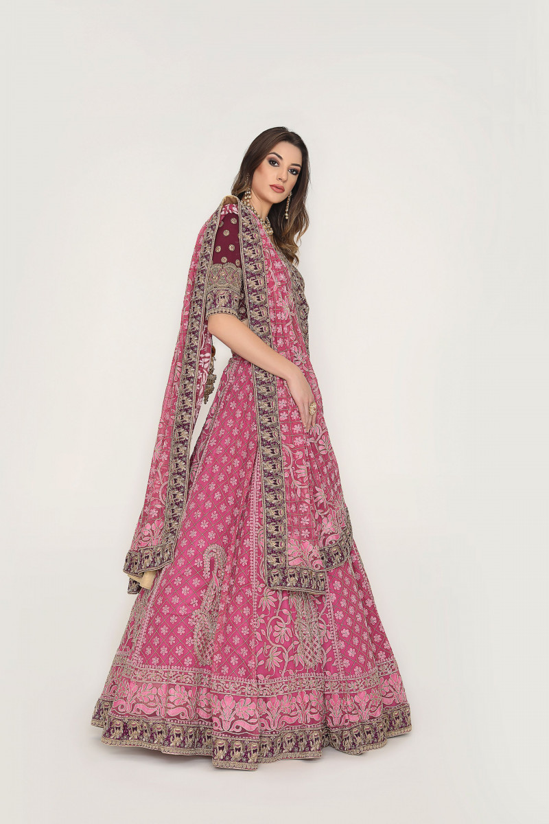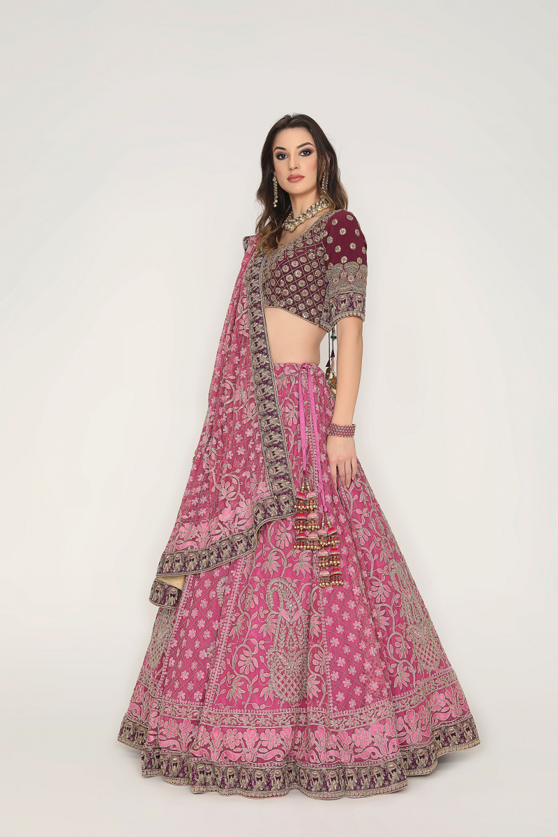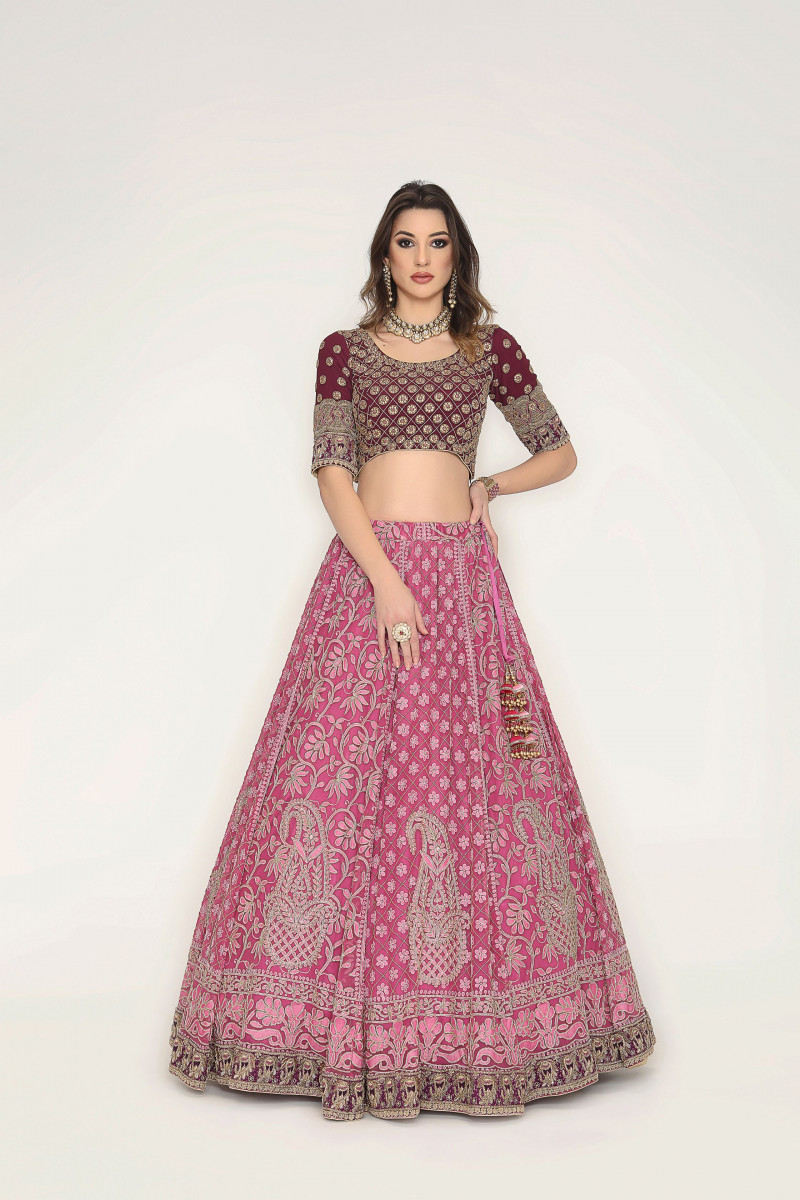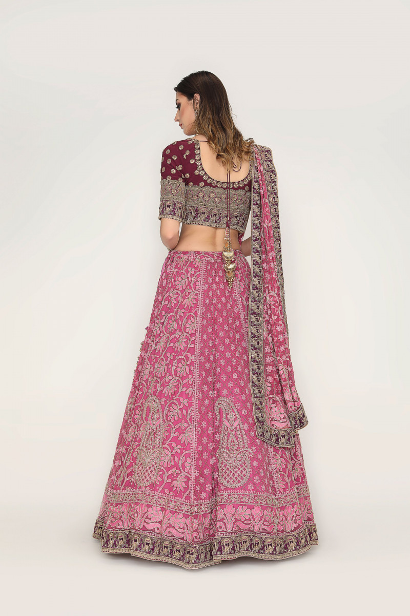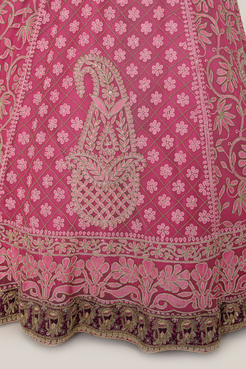 Lehenga/Blouse/Dupatta set A Chikankari masterpiece with traditional floral Jaal & Paisley motif accentuated with cutdana. The detailing Of wine border with pure dabka and silk thread exponentially enhances the lilac shade of Lehenga. The Zardosi embroidered blouse is a perfect match for this beautiful Lehenga.