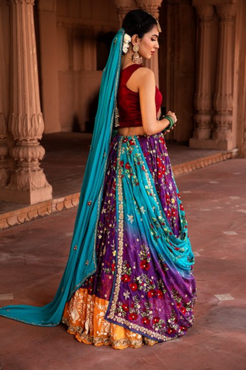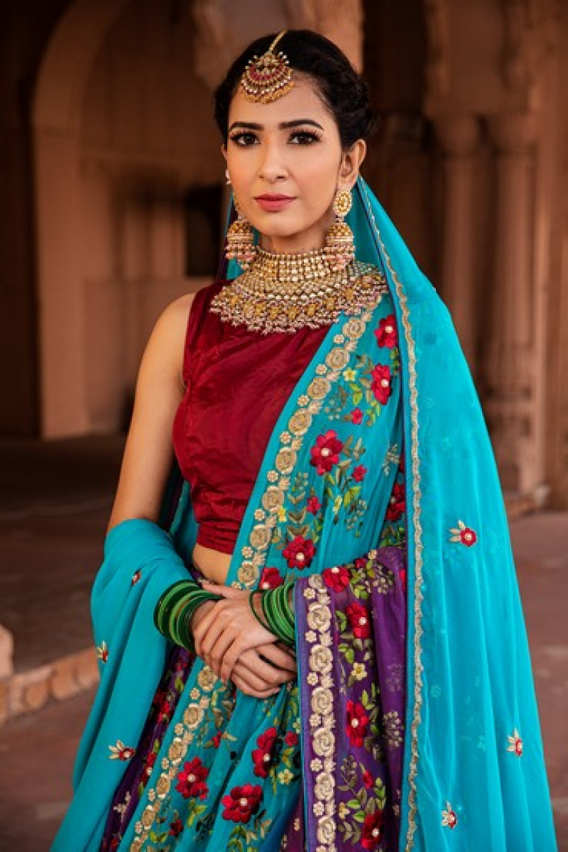 Exquisite traditional Parsi Gara heavy Bridal Lehenga inspired by the precision and beauty of sapphire gems. The intricate Persian floral multi Gara pattern embossed with the beads. The mustard border enriched with the authentic silk thread And dabka work. The double circular flare of the lehenga gives comfy feel in a substantial Royal look.