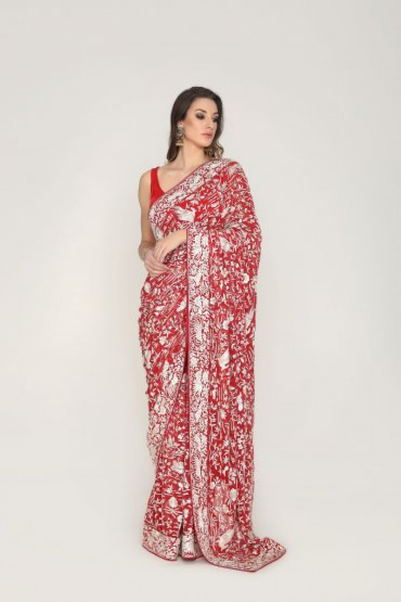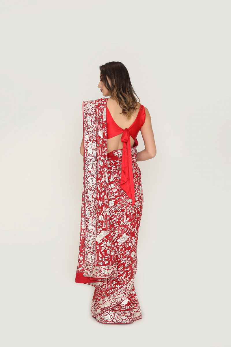 Persian Red beautified with the flora & fauna of the Persian traditional artwork called Parsi-Gara The perfect match for them who believe in Authentic traditions & Just perfect to be a part of the bridal trousseau.