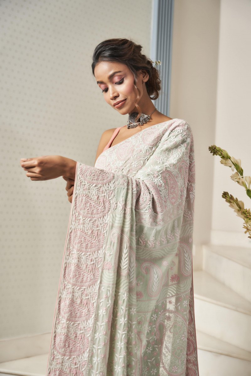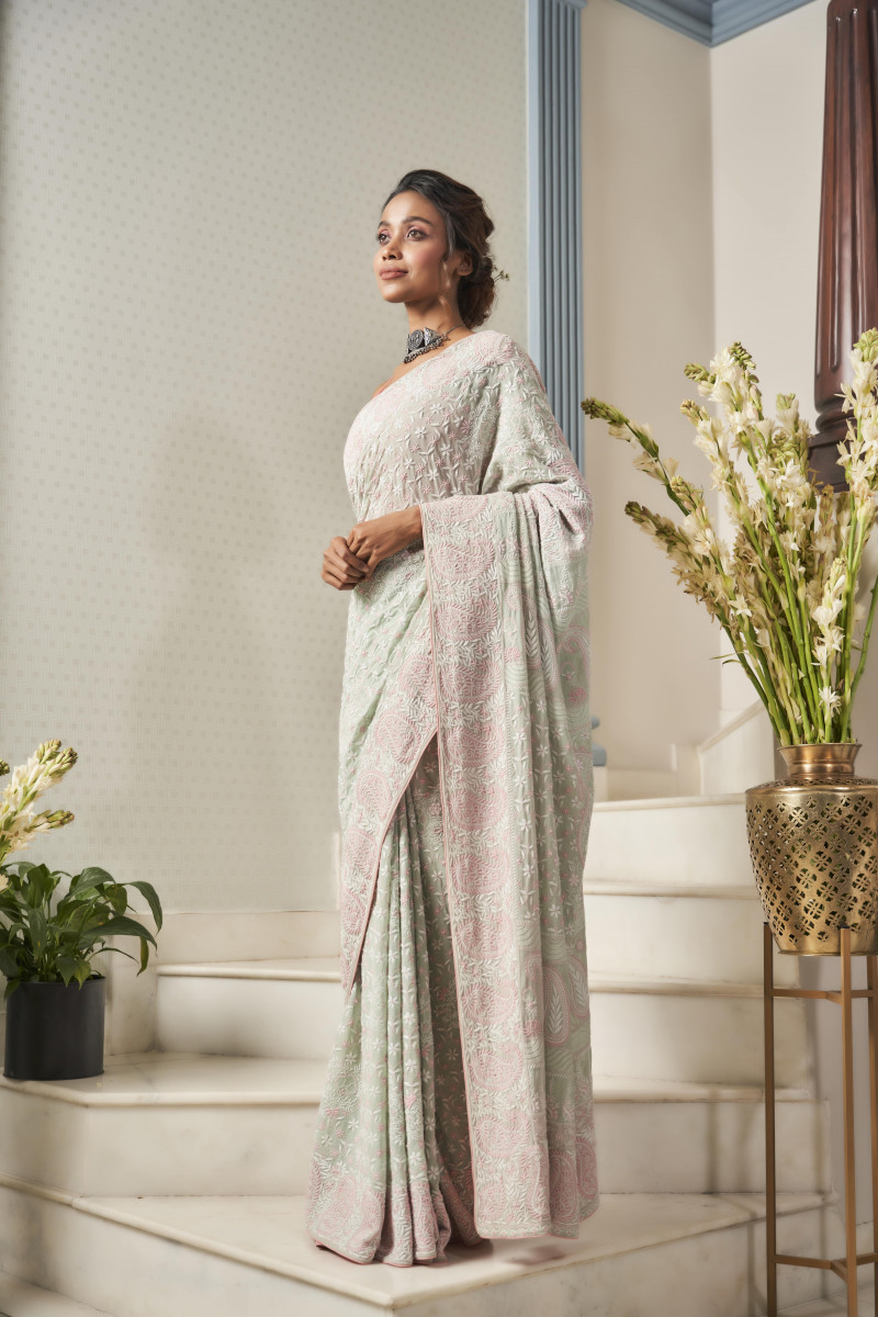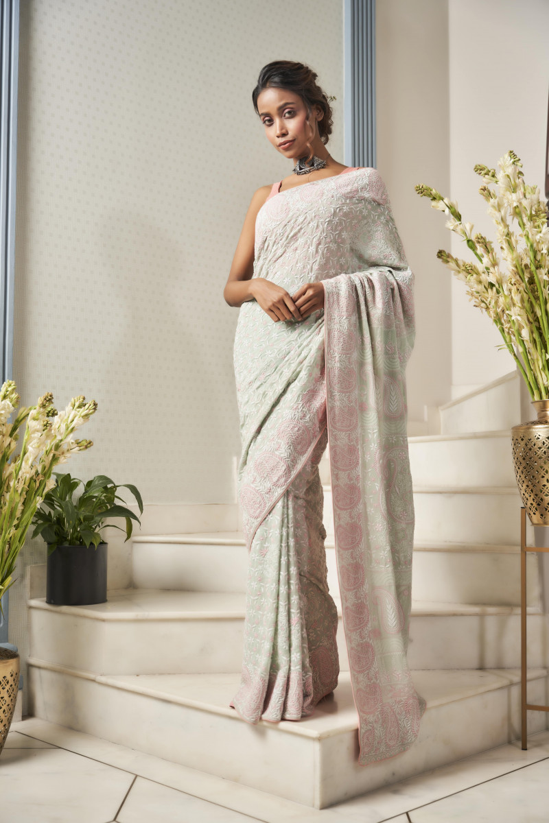 A masterpiece created by the masters of an age-old art form. The embossed details of the saree seek to translate the visionary saga of craftsmanship by borrowing from the beauty of tiny yet intricate pastel spring flowers.
