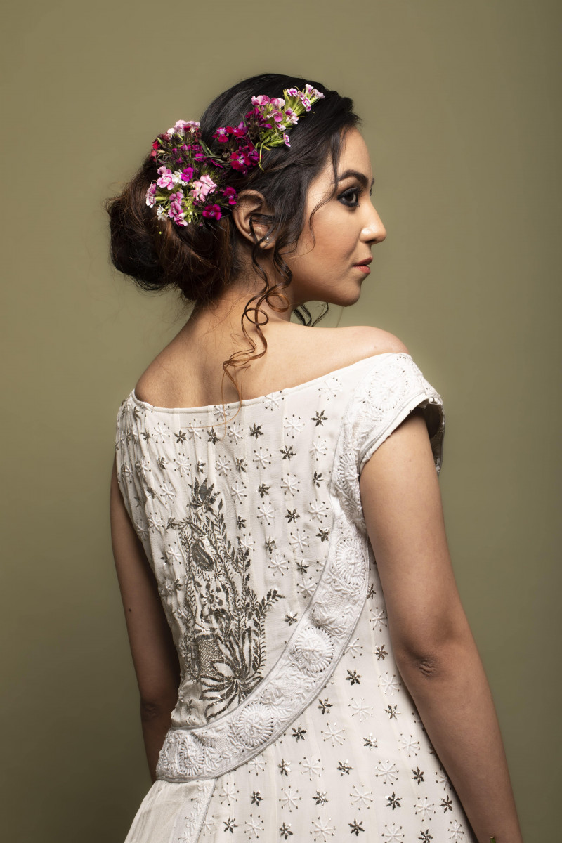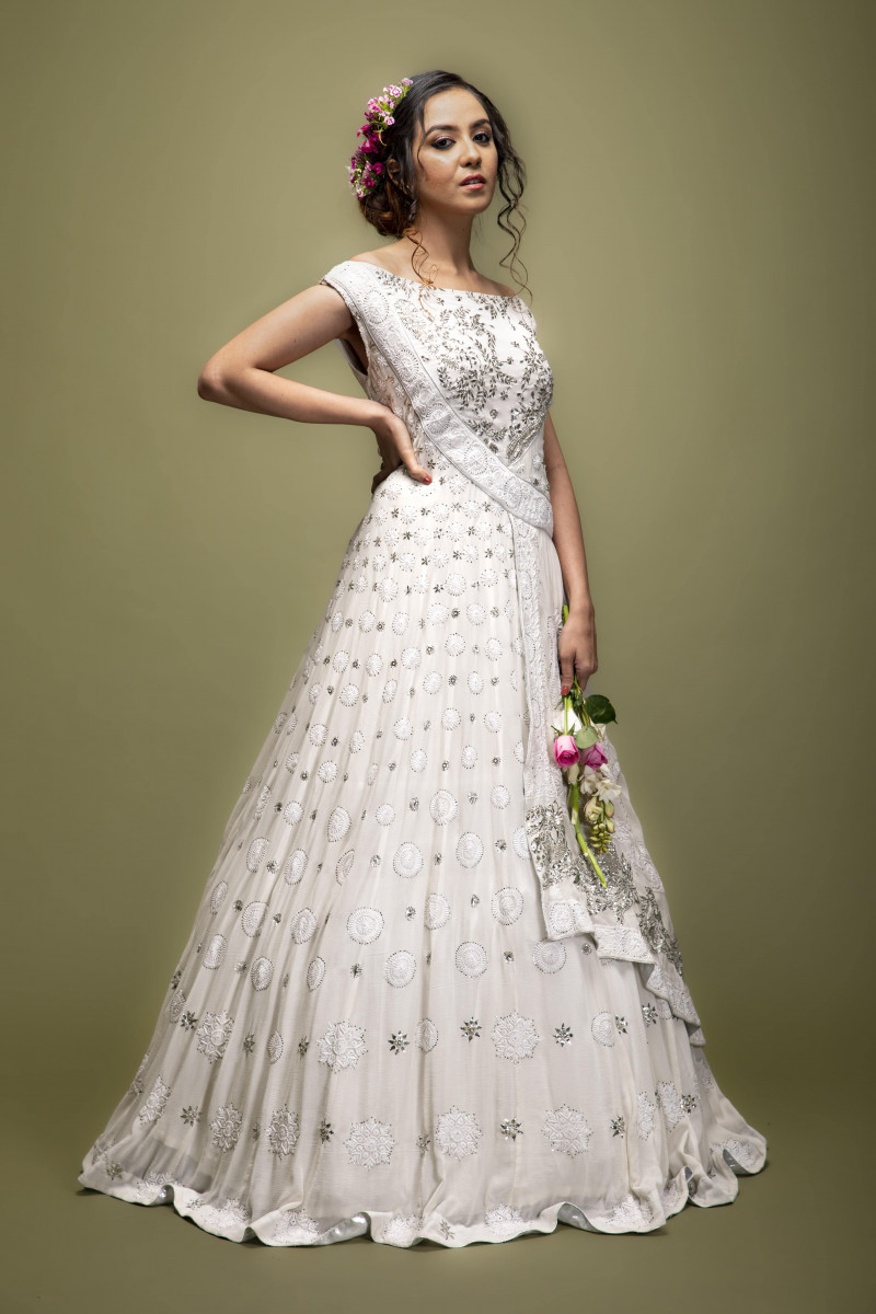 A token of Lukhnawi tradition, this elaborate etheral gown in handembroidered Chikankari and beautifully defined with Mukaish epitomizes grace and class in its pure form! The beloved style statement of the royal era dons a new avatar as designer Renu Dadlani introduces an age-old art with a classy modern gown.