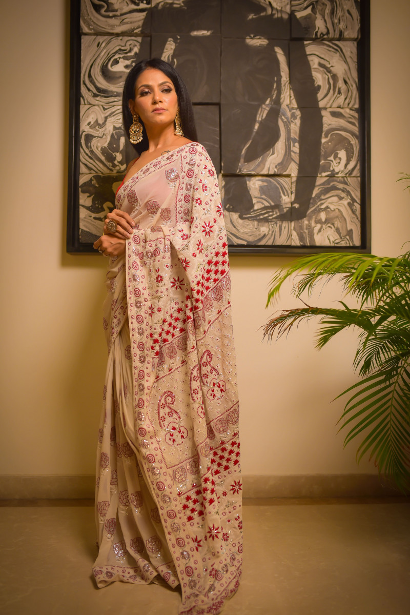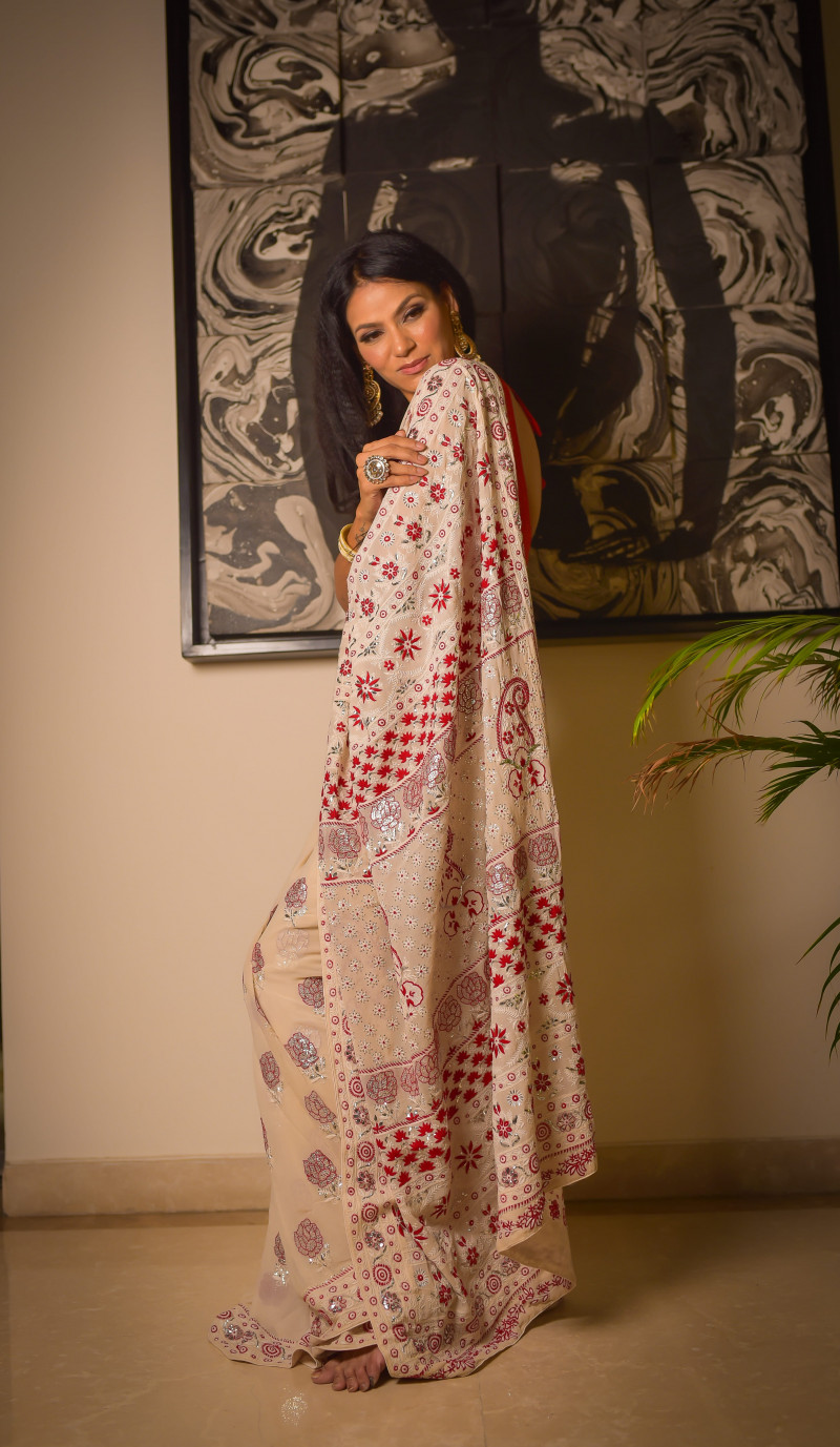 Traditional white chikankari saree enhanced with romantic red roses embellished with Royal Mukaish shimmer. An ideal pick for the trousseau and destination wedding ceremonies.