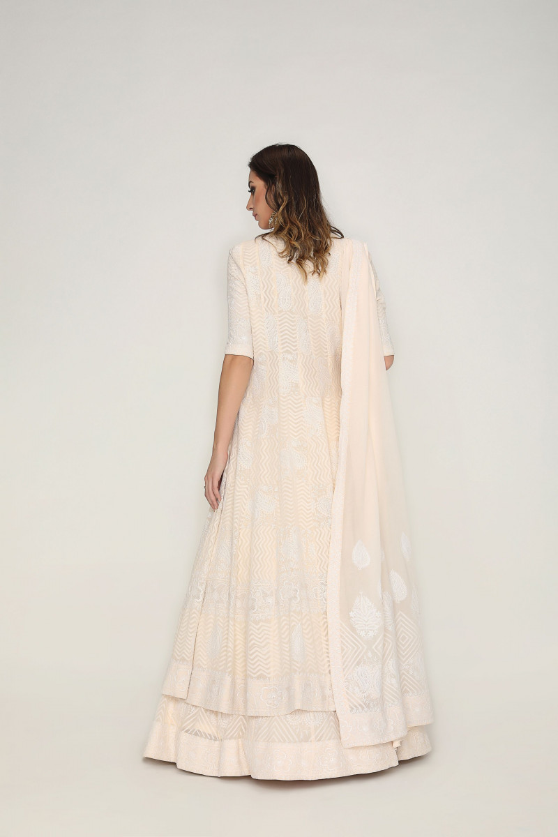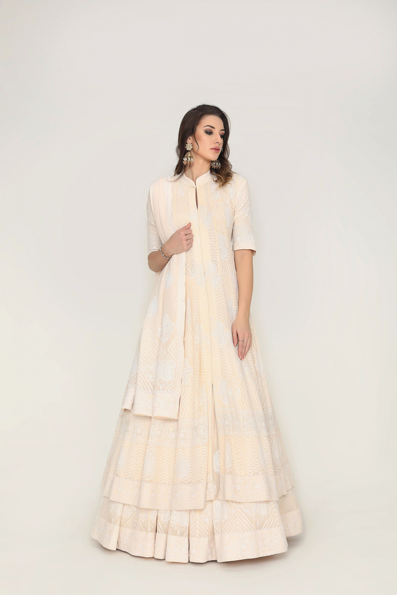 Authentic chikankari at its best! White- a symbol of purity, a value of hues which radiates lights to make you shine. This evergreen ensemble is made with finest Chikankari where white intricate thread work has been done over the ivory base to enhance the beauty of thread craft. The geometry & floral work together give it a classic look.This elegant piece having traditional work with modern Touch took 1 year to complete.