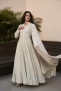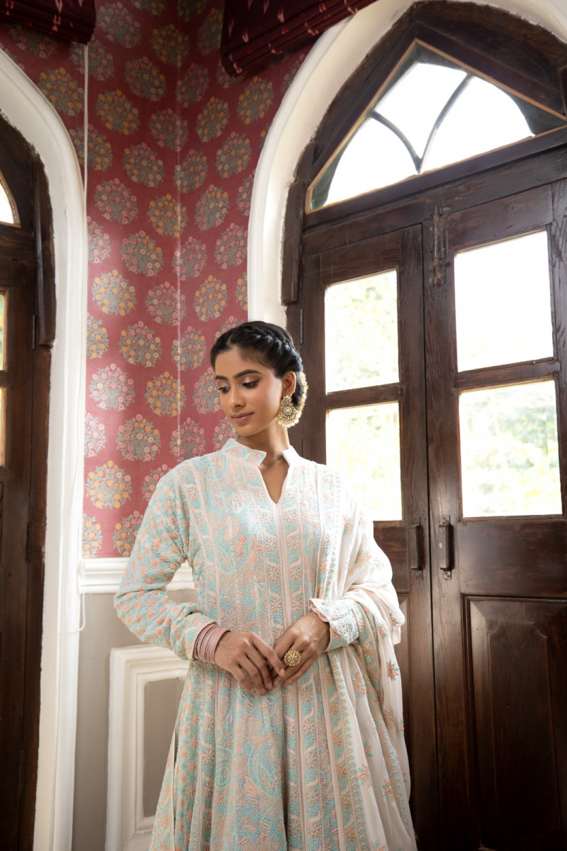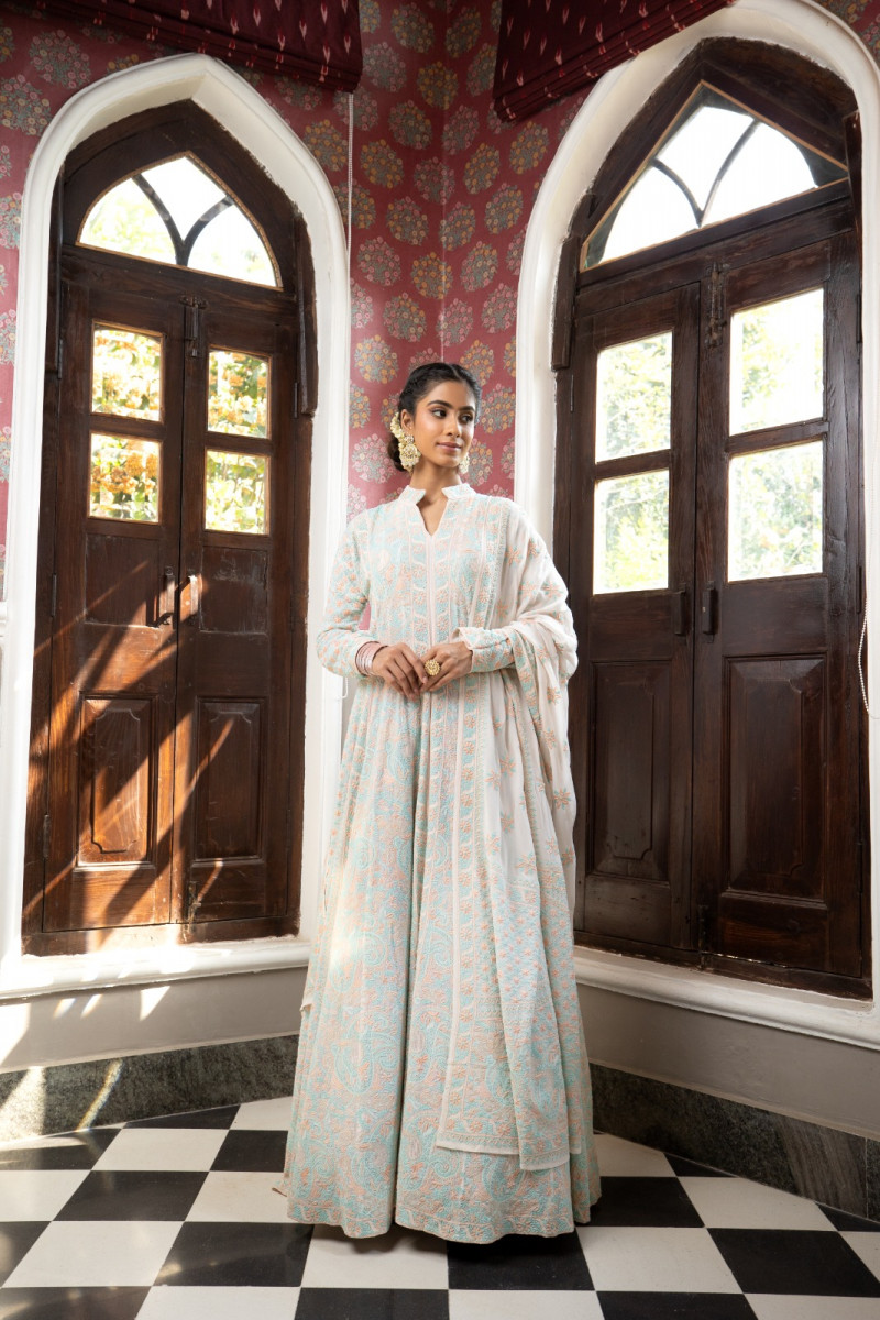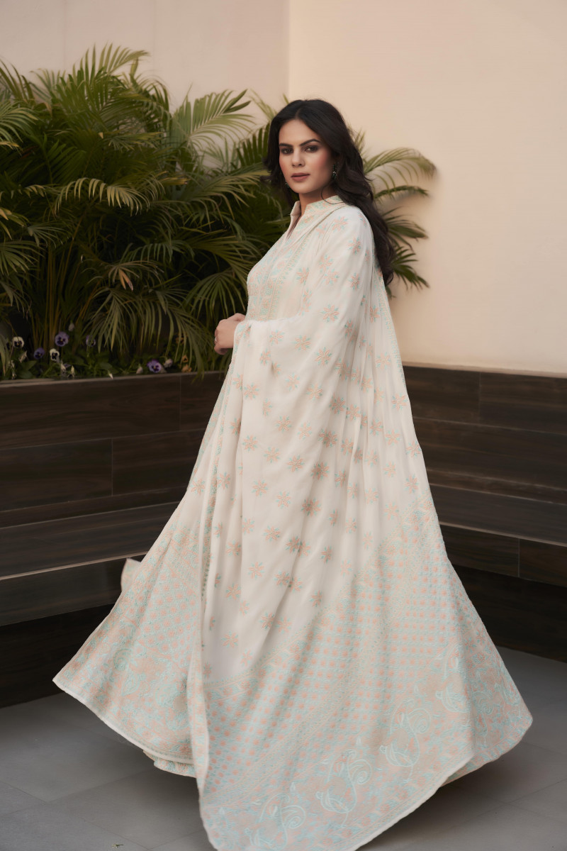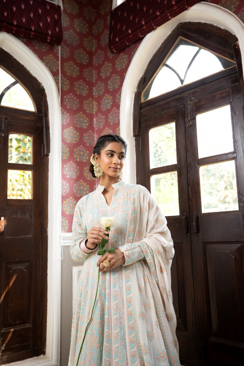 The White multi embroidered heavy Anarkali is a magnificent sight to behold and an embodiment of sartorial sophistication. The eclectic motifs and patterns are a class apart, engraved with the almost extinct stitches of this treasured artform. It is a true gem of Indian heritage that took our artisans more than 24 months to develop. One cannot help but marvel at the meticulous hand-embroidery that adorns this impossibly perfect Chikankari ensemble.