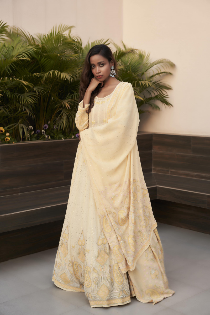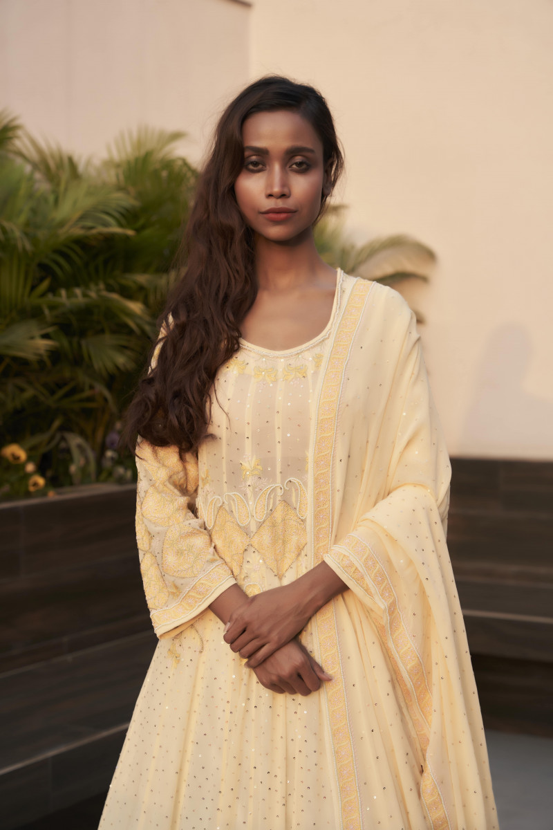 With the vibes of festivity and wedding season, this Chikankari Anarkali is effortlessly decorated with intricate stitches with silk threads and embossed with the delicate beads and cutdana over simple but significant chikankari designs and patterns. A perfect fit for a modern bride’s Haldi ceremony.\