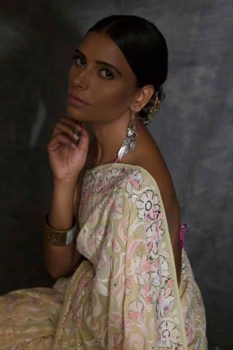 Mesmerizing details! A soft yellow saree enhanced with the blush pink chikankari Threads and embellished with Royal Mukaish shimmer. An ideal pick for destination wedding ceremonies.